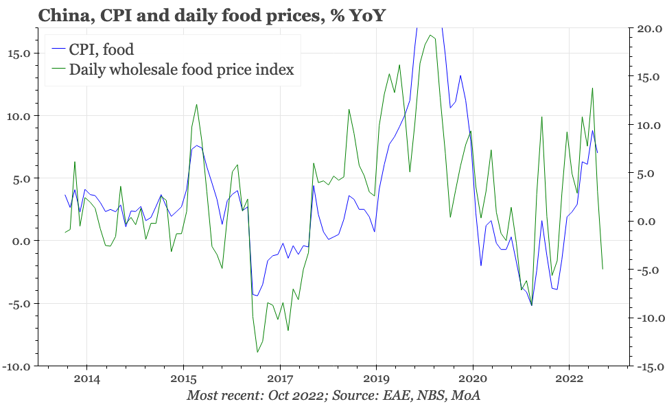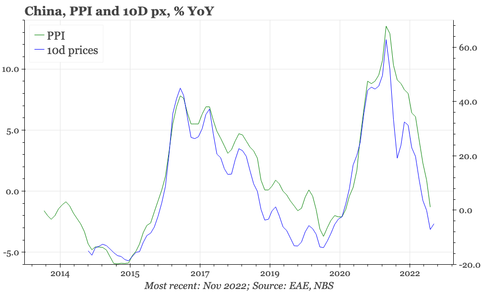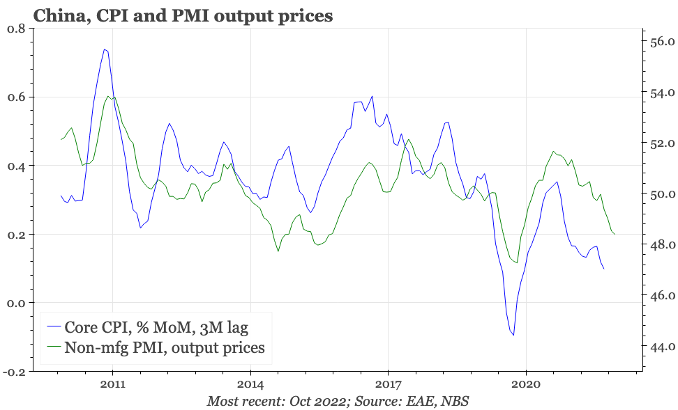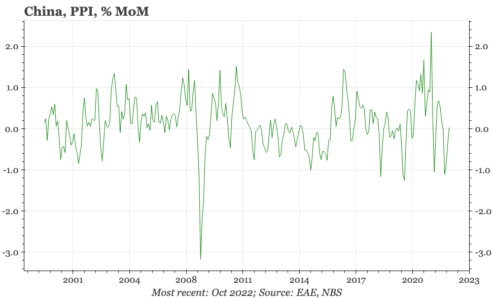 In October, headline PPI fell back into deflation, and CPI inflation eased quite sharply too. But there are signs that China is nearer the end of this deflation shock than the beginning.