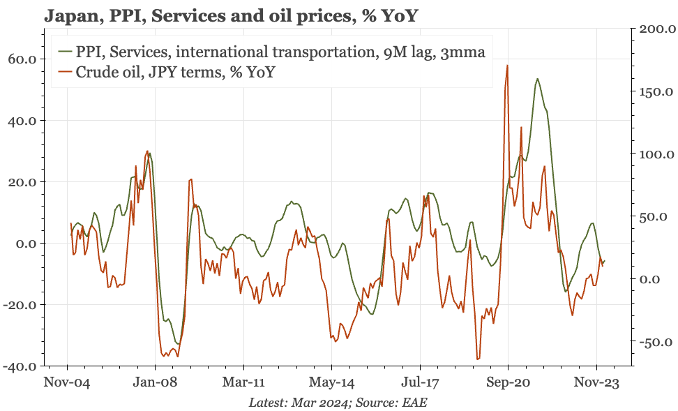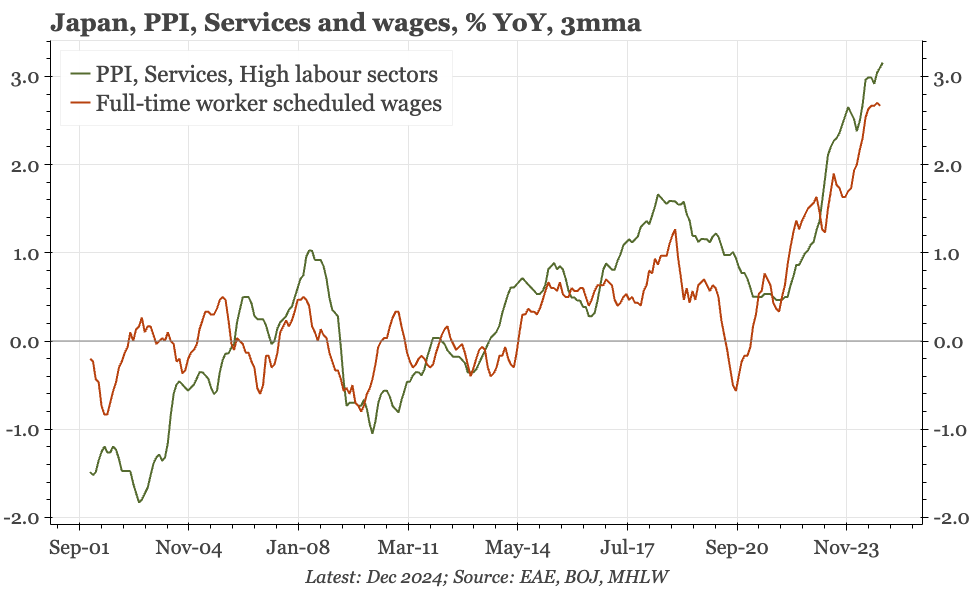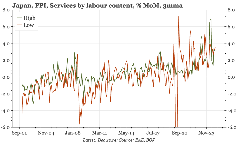 SPPI inflation remains in an uptrend, and is now running around 3.5% saar. A few months ago the BOJ rejigged the data to include a breakdown by labour content, and that shows SPPI rising most quickly in high-labour industries. This will give the bank further confidence in its price-wage story.