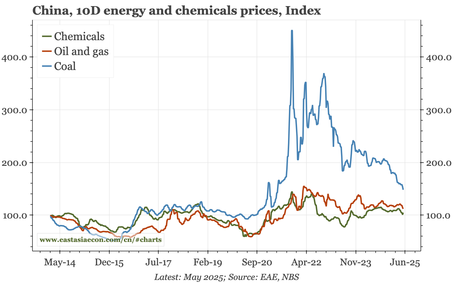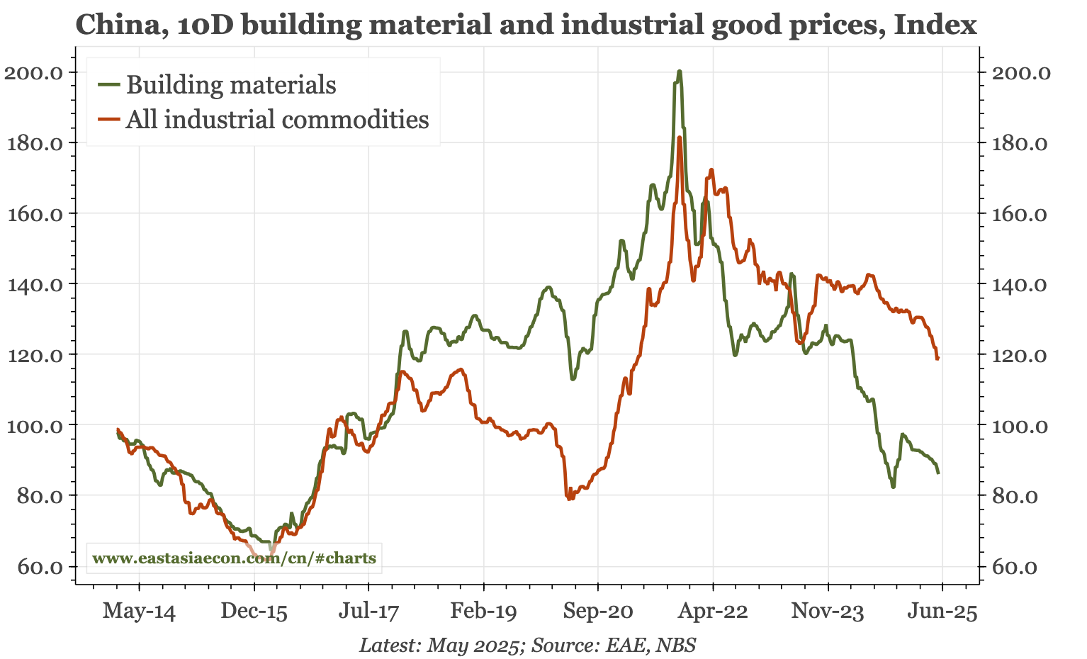 The recent renewed decline in upstream prices is partly about energy, and so will provide some help to manufacturers. However, in a sign of the continued weakness of construction, building material prices have also dropped, and the acceleration in PPI deflation is rarely a good sign for the cycle.