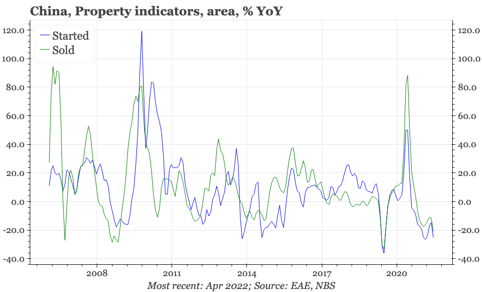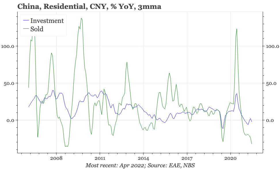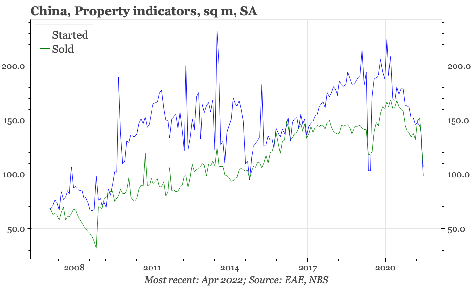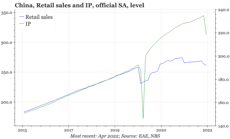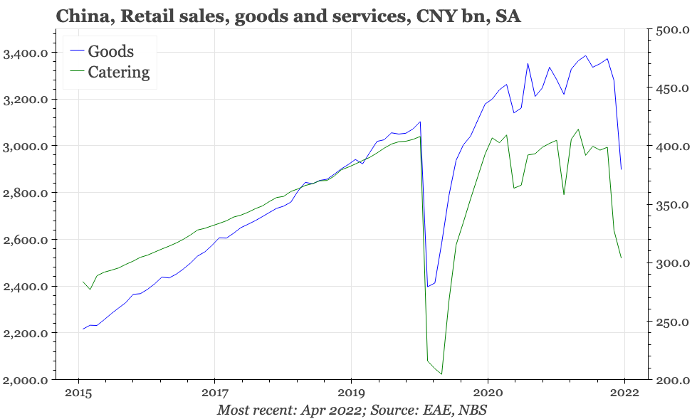 The lockdowns that are being used to get back to zero covid have clearly had a considerable impact on growth, and some sort of bounce can be expected when lockdowns end. However, it is notable that the weakness in April was more visible in industry than services. And yesterday's announcement of a cut in mortgage rates – given broad-based property easing had until now appeared to be off the agenda – clearly shows that officials are getting more worried about the cycle.