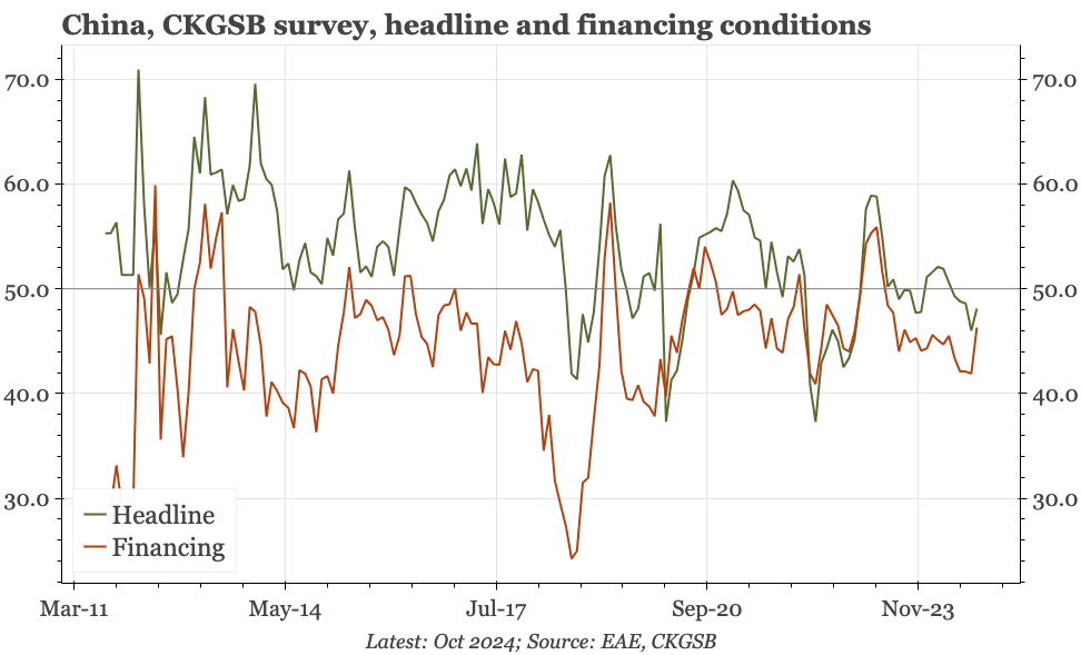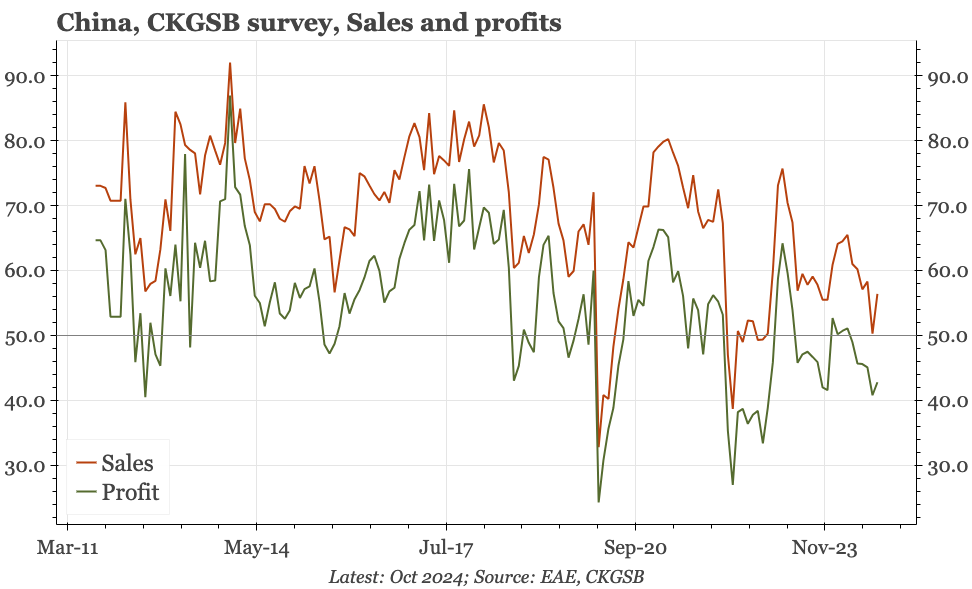 We'll find out more with tomorrow's official PMIs, but while the CKGSB survey for October does show an uptick in overall sentiment, the measure for employment remains very weak. With profits terrible in September, it is clear policy needs to do a lot to turn the cycle around.