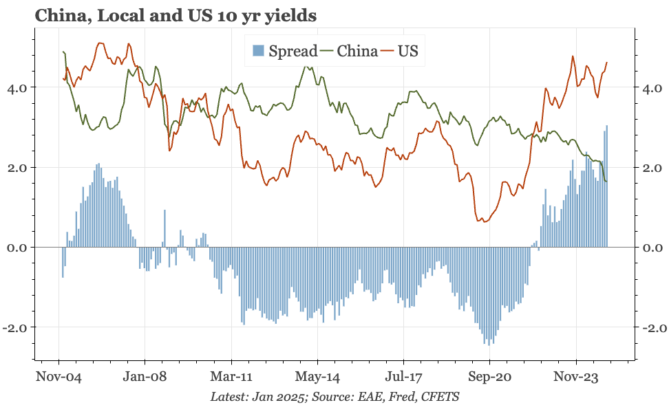 $CNY has started to move this year, but it isn't clear that the currency is yet pricing in tariffs. The sharp fall in onshore rates has further widened the spread with US yields, and that gap alone points to $CNY rising towards 7.7.