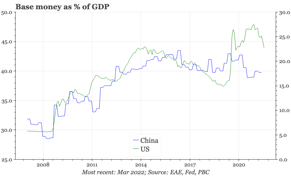 Of course, in monetary policy, China really didn't do any of the things that Guo Shuqing promised they wouldn't. It can be debated whether monetary policy overall was ever very tight – actual interest rates never rose in 2021, and are now 100bp lower than they were at the peak in 2018 – but China clearly didn't engage in the central bank balance sheet expansion that was seen in the advanced economies.