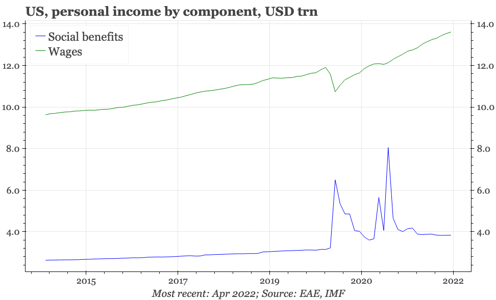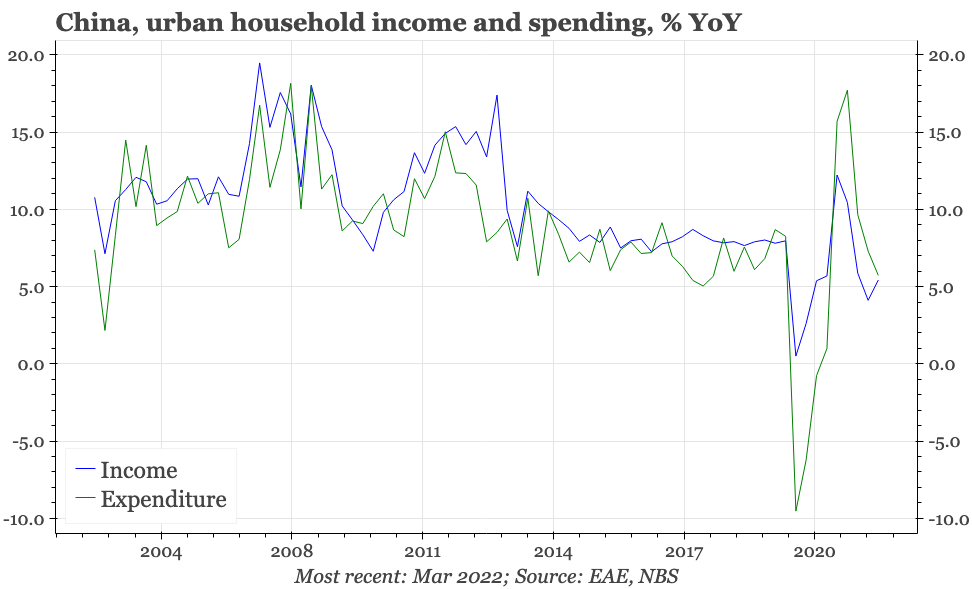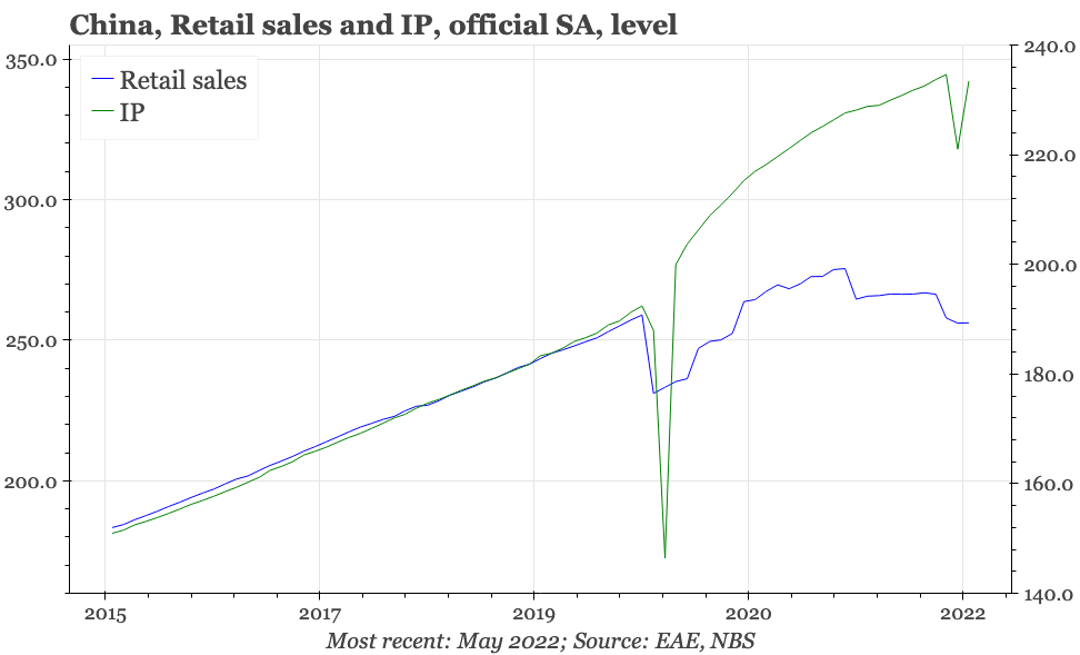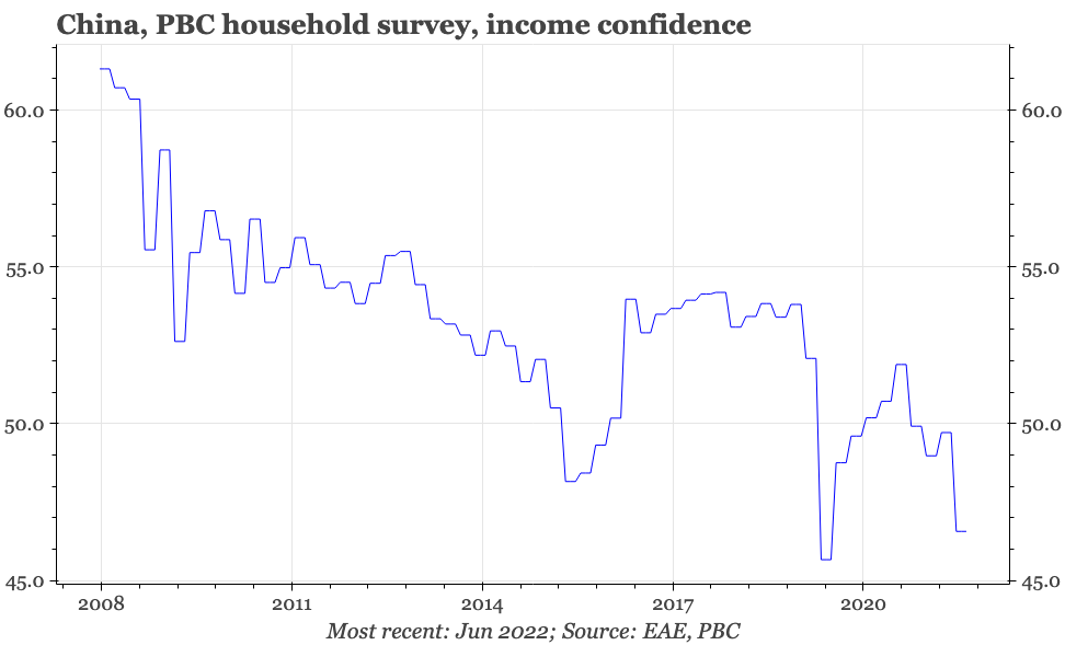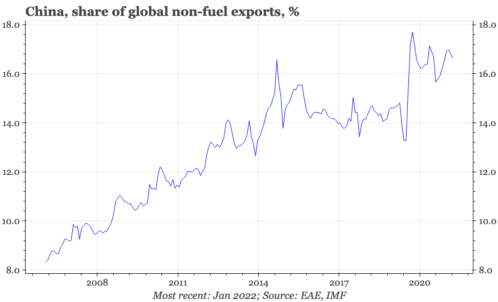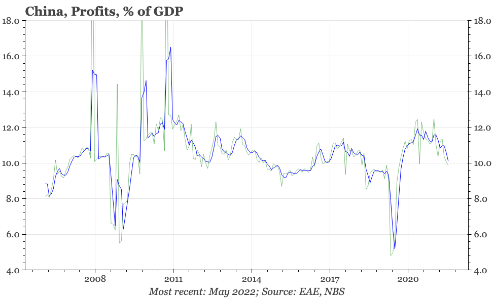Still, as much as going overboard on social security probably isn't the best answer to the weakness of confidence in the household sector, the for the whole economy going overboard with corporate help doesn't feel like an ideal way foward either. That will probably become more obvious in the next few months, because unlike in 2020, the corporate sector this time around won't be pulled out of China's lockdown-induced slowdowns by a big rise in external demand. With nominal growth likely to be low again this year, and the government having once again to loosen fiscal policy, the leverage ratio will rise again.