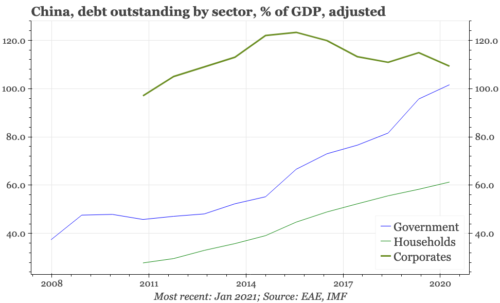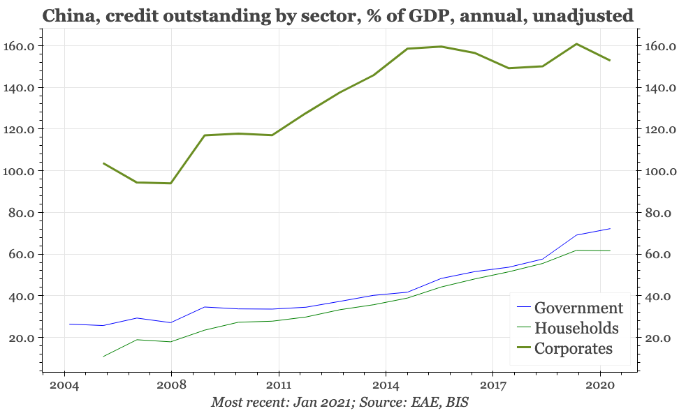 By contrast, in China, it was corporates were the targets of the government's 2020 largesse. Unlike household incomes, corporate profits rebounded very strongly after the Wuhan lockdown. To be clear, that wasn't only because of government tax policy: lower interest rates have helped, as did the sharp rise in commodity prices and exports as global demand recovered from the pandemic-induced recessions. But China's annual flow of funds accounts do also show a pronounced fall in the net payments the corporate sector is making to the government.