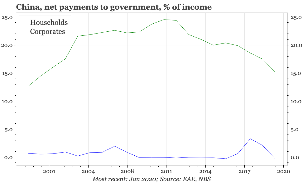 This same dataset makes clear that the easing of the tax burden on companies, like the seemingly secular fall in interest rates of recent years, is a policy that began well before covid first appeared. Given that the institutional bias of economic policymaking in Beijing to favour investment and companies over consumption and households has an even longer history, it is somewhat surprising that the corporate sector's burden has needed lessening at all. But that it has now been cut represents the immediate policy preferences of the premier, Li Keqiang. Even before covid he was pledging to: