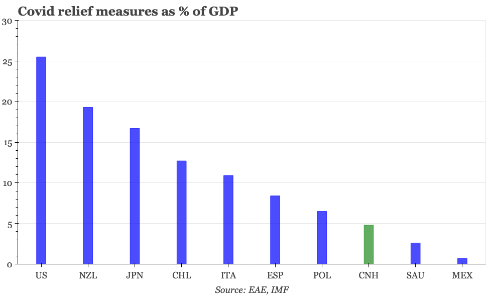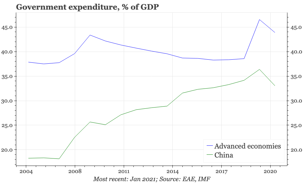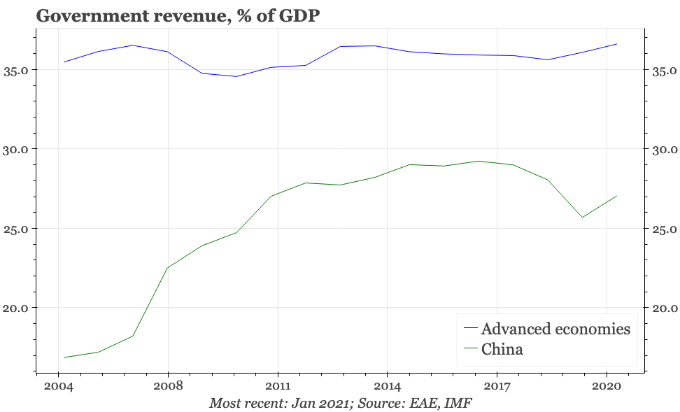 As in the US, most of the rise in debt in China in 2020 was due to borrowing by the government. But the policy direction financed by that official borrowing was quite different in China from the advanced economies. Elsewhere, the funds were used to finance spending: on average, government spending in richer countries surged by almost 8ppts relative to GDP in 2020. China's government did increase spending too, but modestly, choosing instead to focus on tax cuts. Spending did increase a bit in 2020, but then fell back. But in the first year of the pandemic, government revenue fell 3.4% relative to GDP, and remained low in 2021.