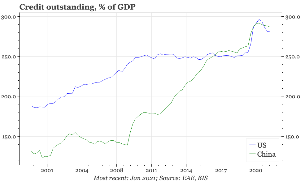 In any case, in terms of deleveraging, the real estate industry was the exception last year. Total credit in CNY terms in China rose by a bit over 11% in 2021. That is slow relative to the record post-2008, but was actually faster than in both 2018 and 2019. Debt growth did rise by 13% in 2020, which was a bit faster than recent years, but actually below the average 15.7% in the 2010s. Looked at from this perspective, and while China's deleveraging of 2021 isn't particularly obvious, nor is the policy easing of 2020. In the US, meanwhile, credit rose 5% in 2022, which was about average compared with the 2010s, but much slower than the 13.5% increase in 2020.