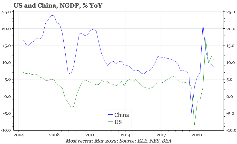 It terms of the unfortunate trend of politicians in both China and the US to judge relative success as being in part the ability to outgrow the other, it would be easy to think this would be a pyrrhic victory. No doubt, Guo Shuqing and others would be arguing that high inflation isn't desirable because it will trigger a monetary policy tightening that will ultimately depress nominal growth. On the US side, that does seem likely – but after this year's unilateral lockdowns, NGDP growth in China is hardly going to be stellar either.