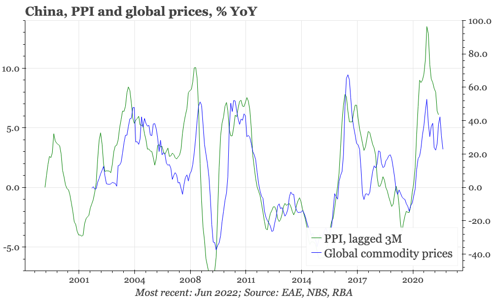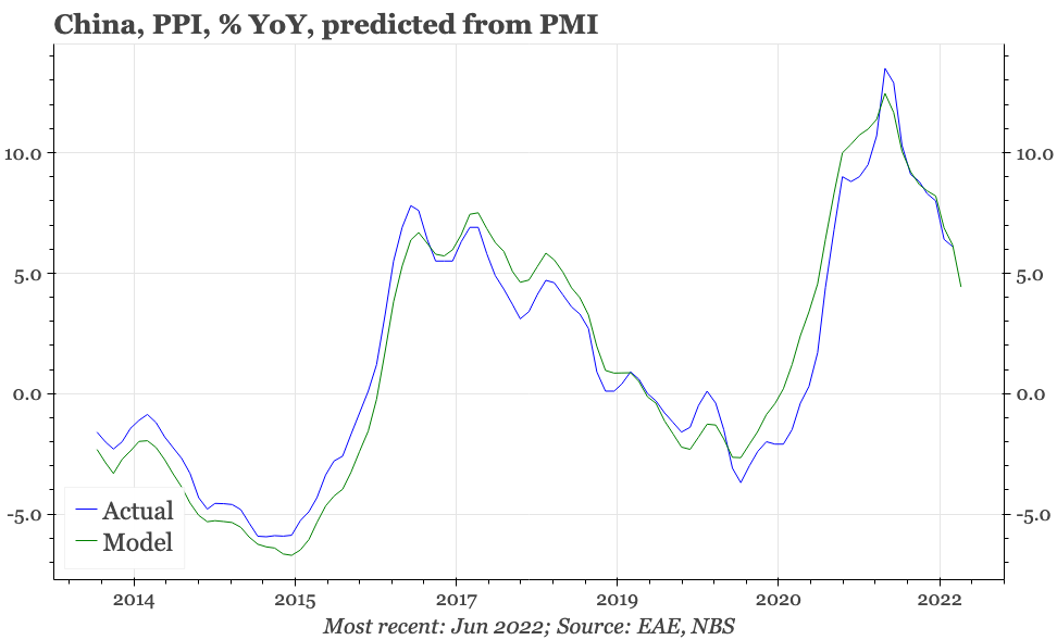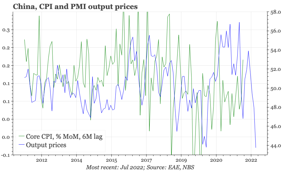 Input prices were also weak in July, indicating PPI inflation last month of 4.4% YoY, down from 6.1% in June. That is probably good news for smaller, downstream firms. But falling PPI isn't usually associated with strengthening activity overall. Moreover, while PPI above 4% isn't particularly weak, other leads suggest there's more downside for PPI inflation beyond July. Lower inflation that dampens nominal GDP won't help flatter China's debt profile.