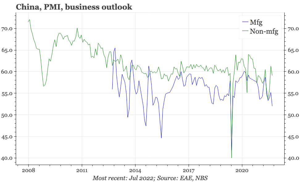 Most other datapoints, however, have been negative, and continue to suggest that activity growth is more likely to slow. Four developments are of particular importance. First, there is the weakness in yesterday's official July manufacturing PMI. The National Bureau of Statistics blamed that partly on seasonality, which isn't a great explanation when the headline series are supposed to be seasonally adjusted, but is even less convincing as a reason for the fall in the outlook score to the lowest since the Wuhan lockdown. Since that time, business expectations have remained reasonably buoyant, suggesting companies think the frequent cyclical difficulties would prove temporary. It is important that this underlying optimism now shows signs of fading.