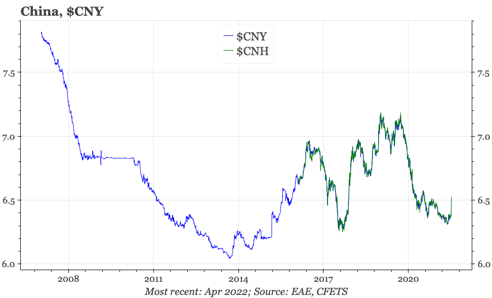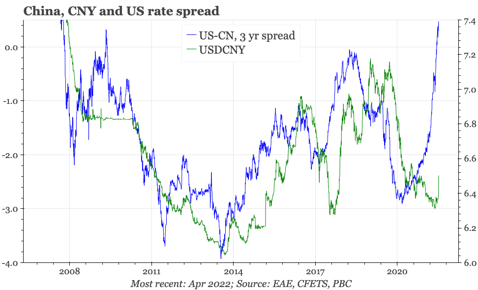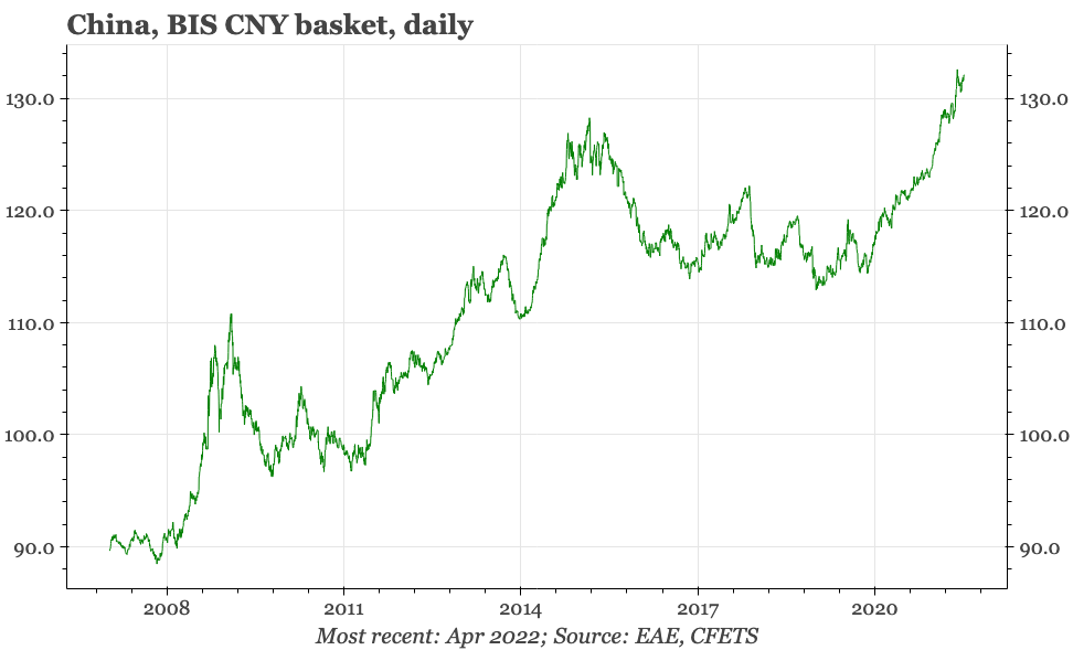 It is probably still reasonable to assume that there will be somewhat more concern about inflation from policymakers in Beijing as long as covid control remains the number one priority for the government, and thus that lockdowns and other restrictions remain a risk for the economy. It is probably also true that now the currency is moving, the central bank will likely want to see how much momentum that trend has before itself adding actual rate cuts that would threaten to fuel the downside. Overall though, the poor state of the cycle still suggests there is more easing to come.