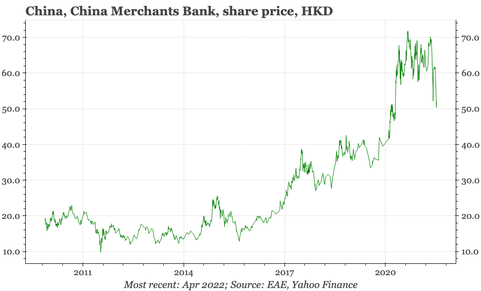 Needless to say, there will be no stabilisation of the economy if one big important city after another goes into lockdown. But this isn't the only headwind facing the economy. Among other pressures, there's also ongoing corruption investigations in the finance industry, with the latest target being top officials at China Merchants Bank, which - until now - had looked like one of China's more successful financial institutions.