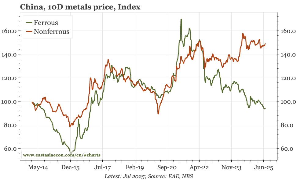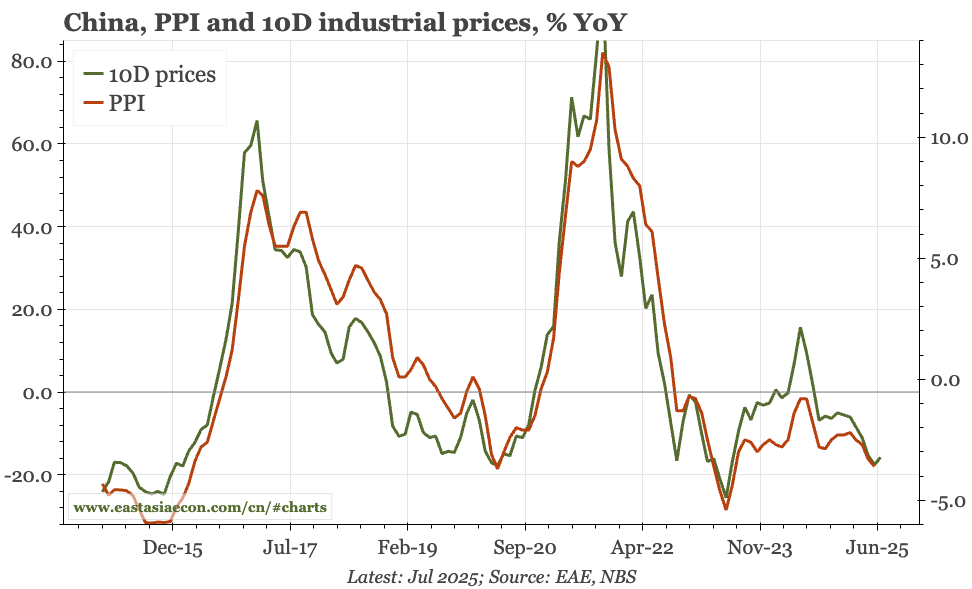 Overall, the big recent drop in upstream prices has stabilised. But for building material prices, there's no respite, now being lower than any time since 2016. That shows the ongoing weakness in the property sector, which none of the policies of the last few years have managed to turn around.