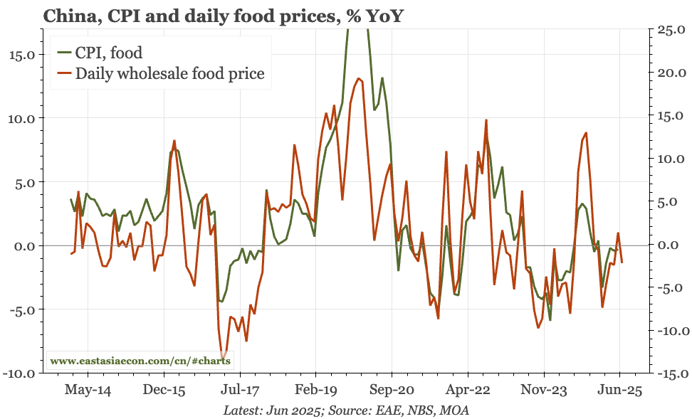 Data through July show upstream industrial prices have stopped falling. That should mean PPI deflation doesn't worsen further. However, underlying demand remains weak, with building material prices continuing to fall. And soft wholesale food prices suggest there's no pick-up in CPI either.