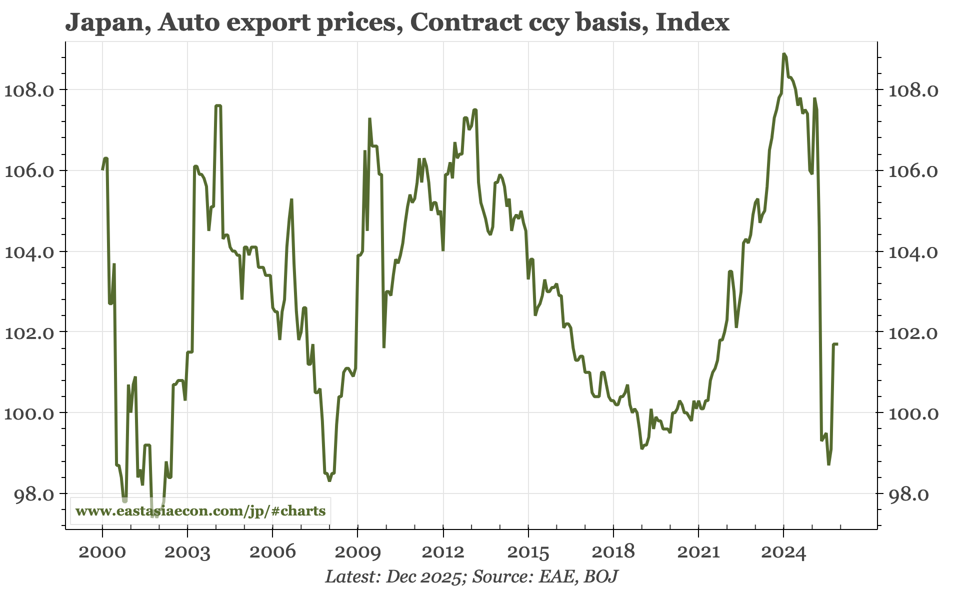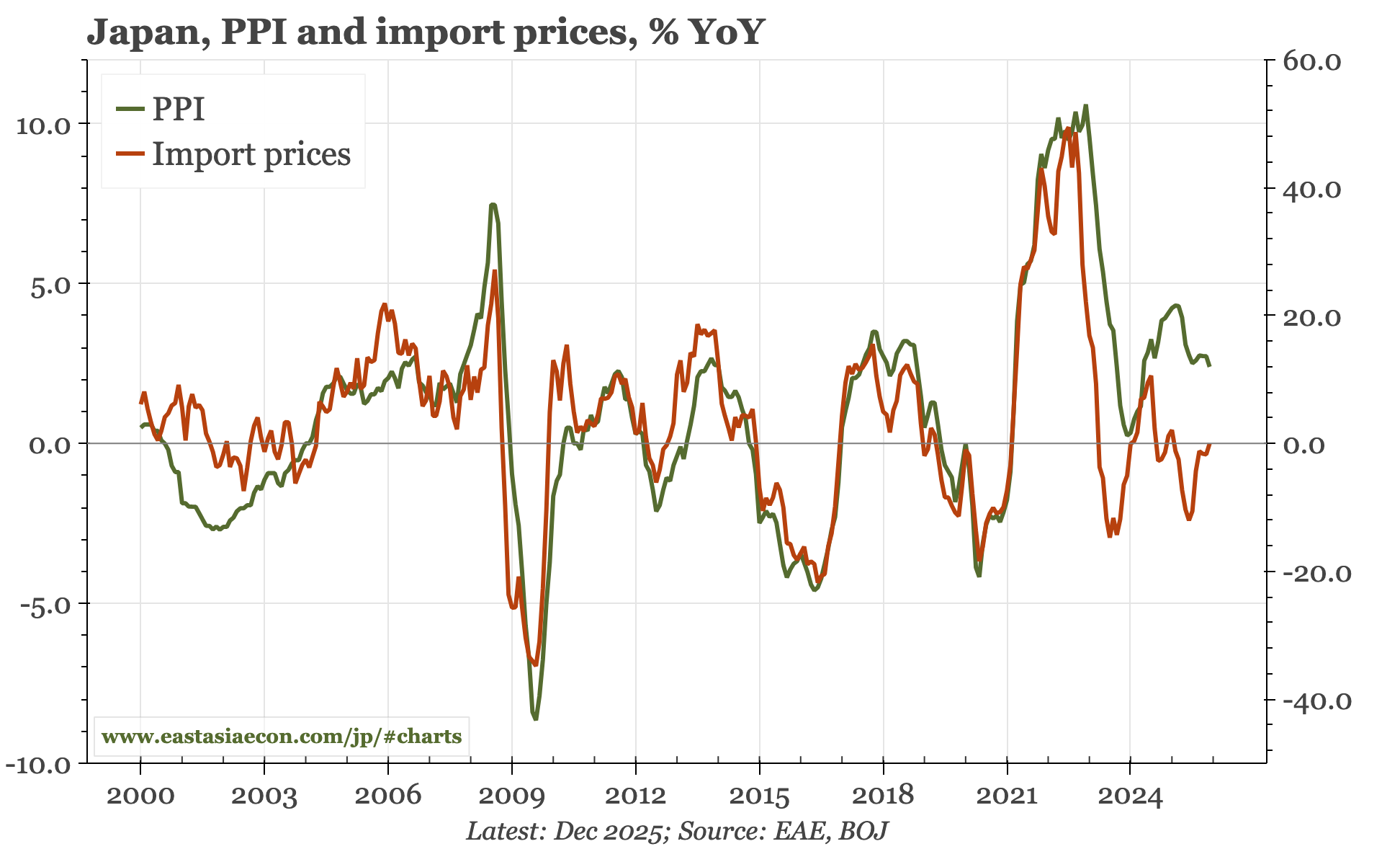 Cycle update – PPI still firm. Japan's current run of PPI inflation is almost the longest since at least the 1980s, but looks well-supported. Prices have recoupled with the global cycle, and are being boosted by JPY weakness. Furthermore, while it was feared that tariffs would be deflationary, export prices are rising.