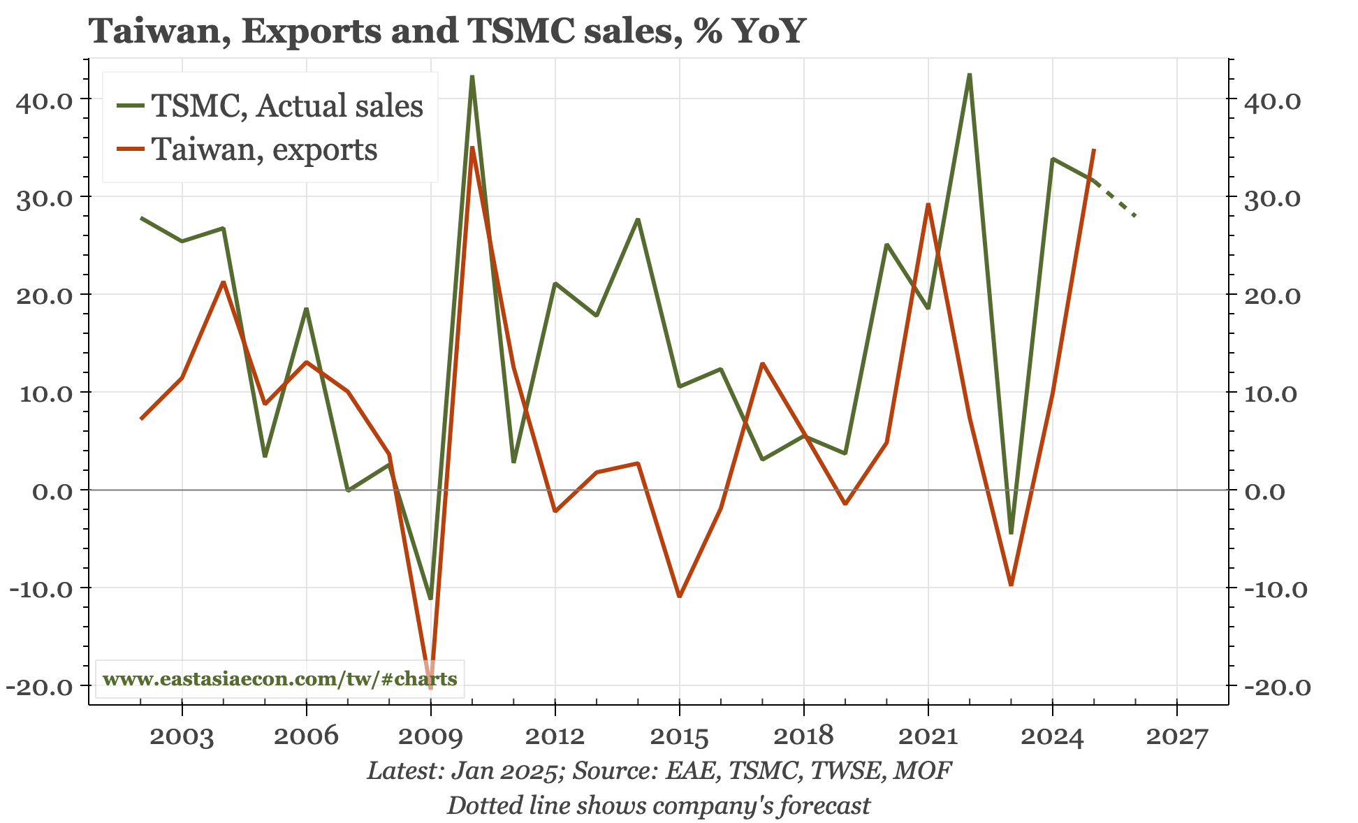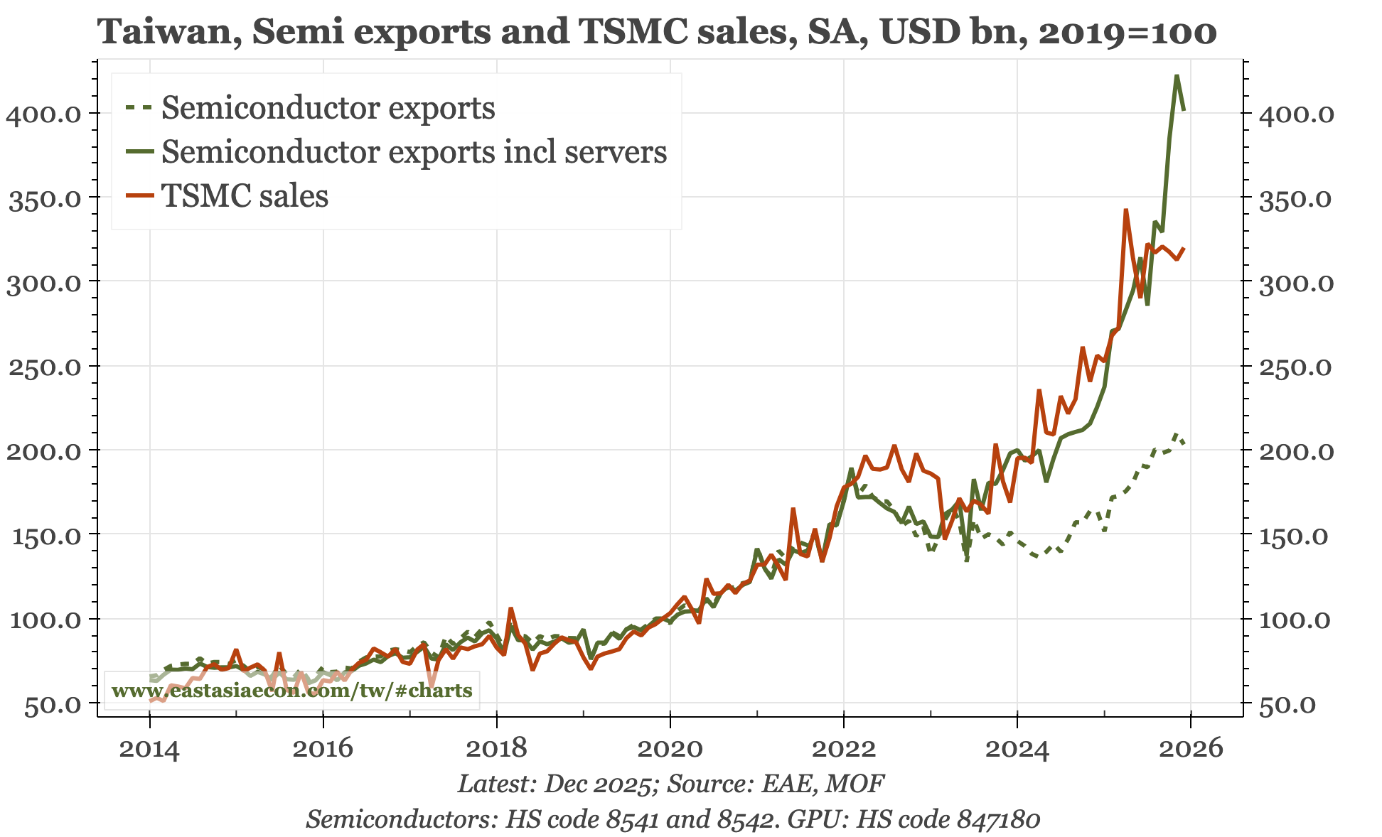 With the company expanding in the US and Japan, Taiwan's domestic economy won't feel all the benefits of TSMC's continued growth. However, TSMC remains Taiwan's largest company, and so these kinds of forecasts are big enough to think the heating up of Taiwan's economy since 2020 – strong exports, rising external surplus, rising wage growth – will continue in 2026. Pressure on the currency to appreciate is likely to grow.