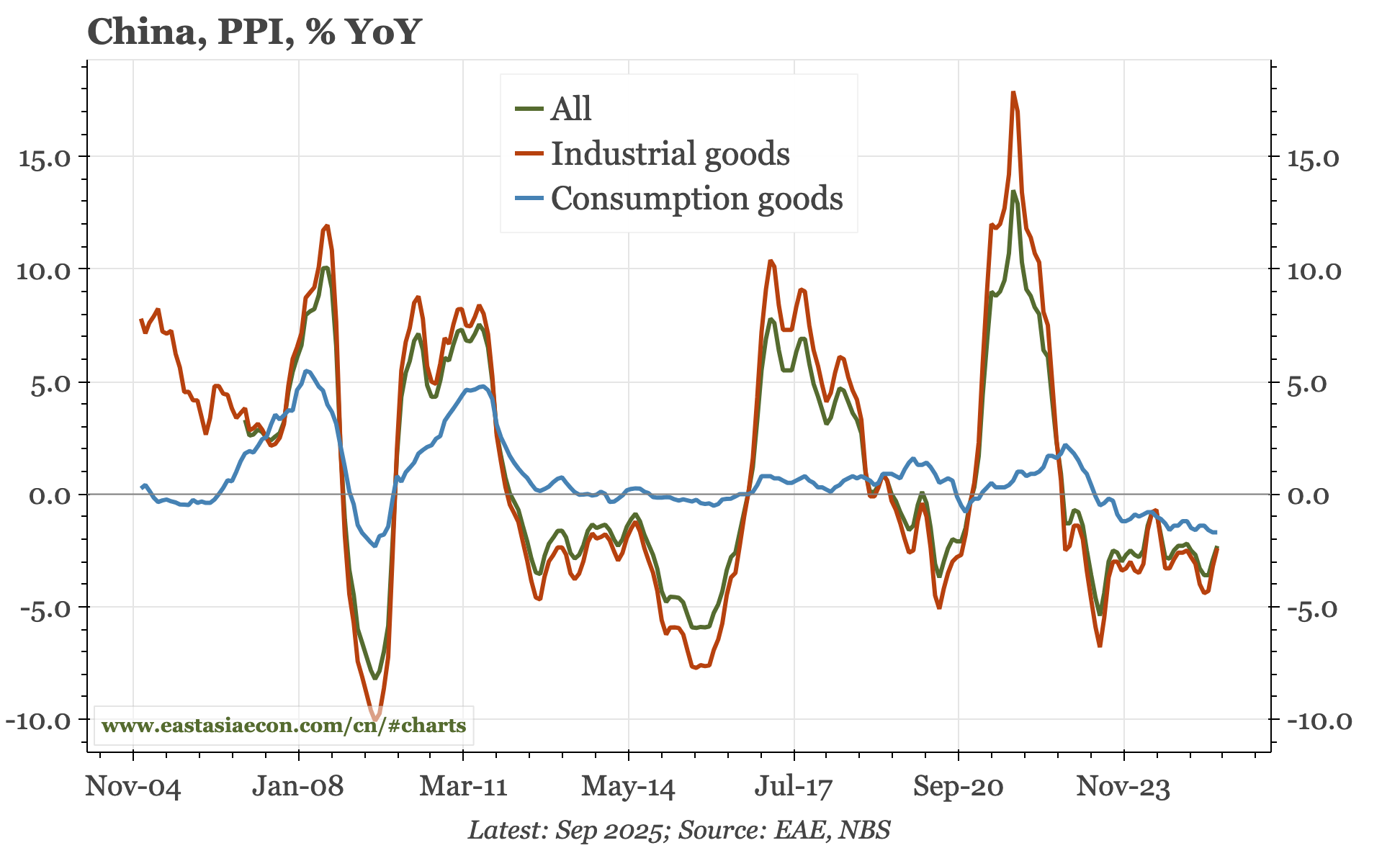 Cycle update – PPI stabilises, but not firmly. The stabilisation of PPI is fragile, with continued sharp falls in some of the sectors targeted by anti-involution, as well as continued weakness in building materials prices. In CPI, falling food prices will eventually reverse, but soft services prices shows underlying CPI inflation remains weak.