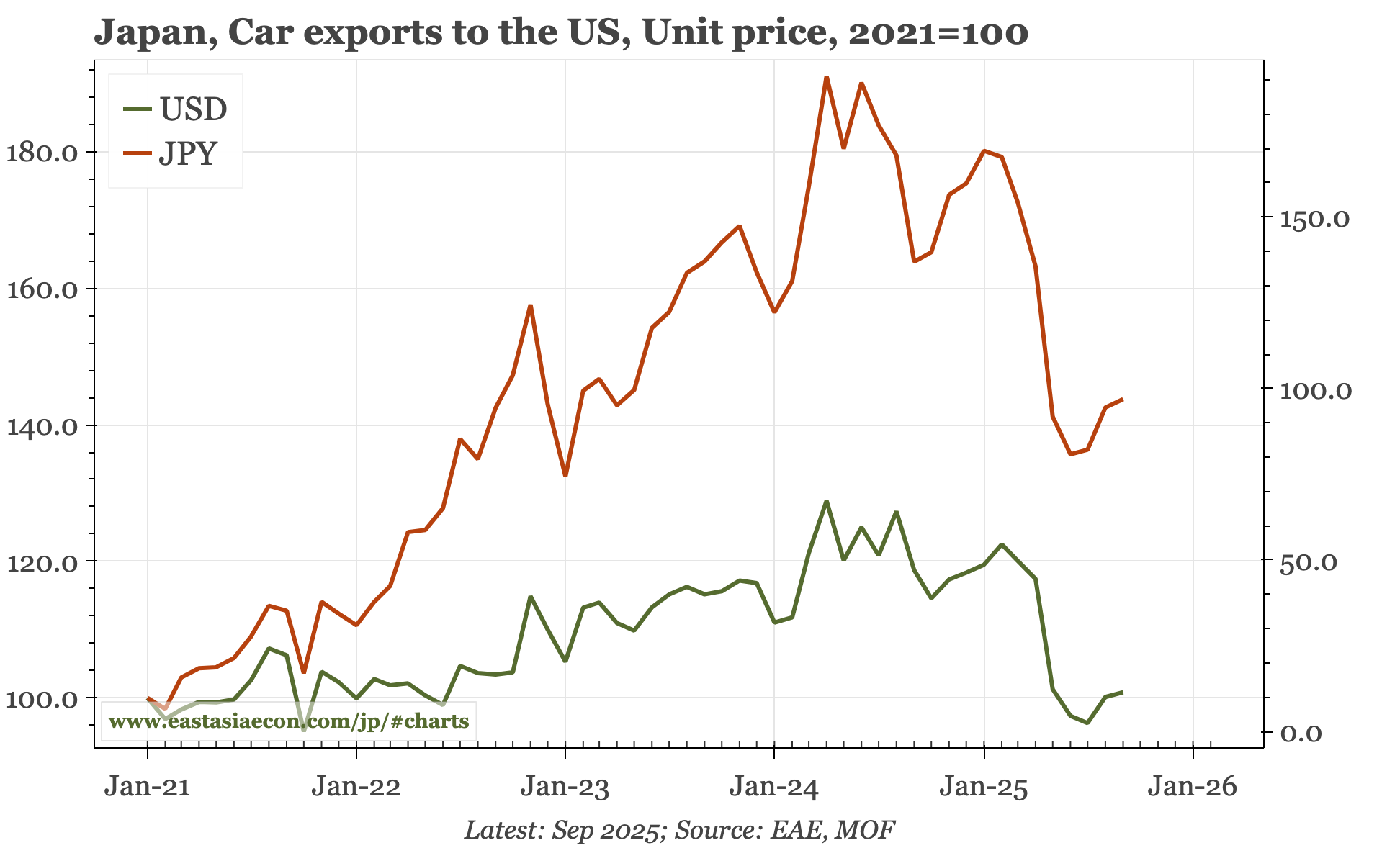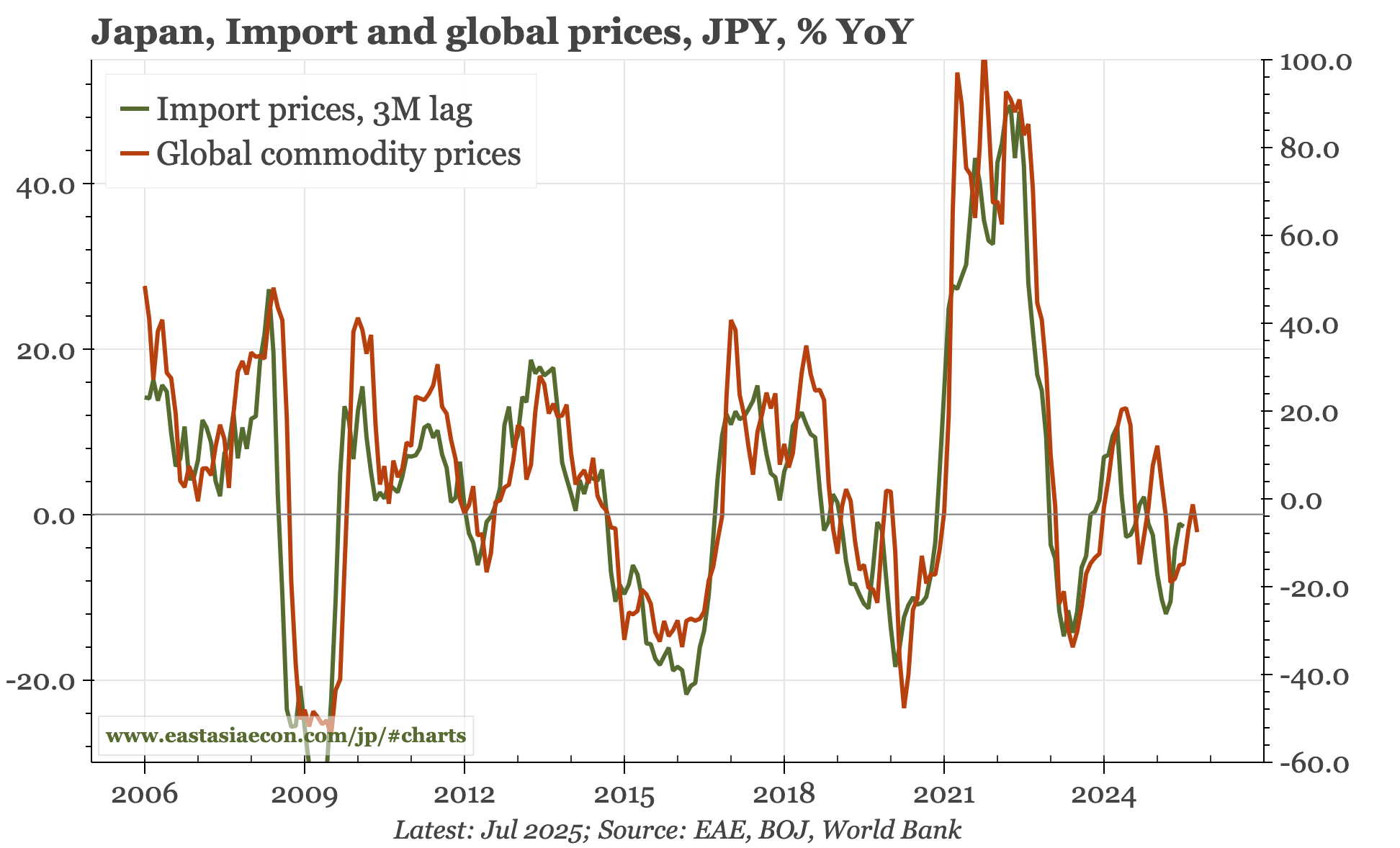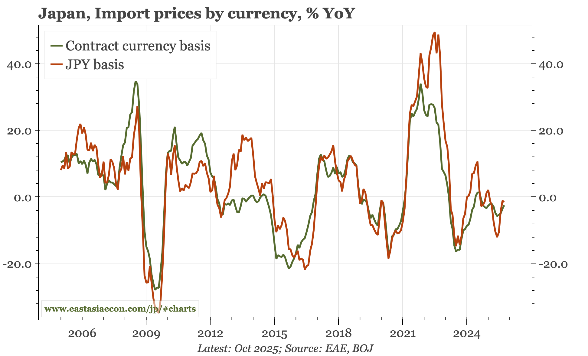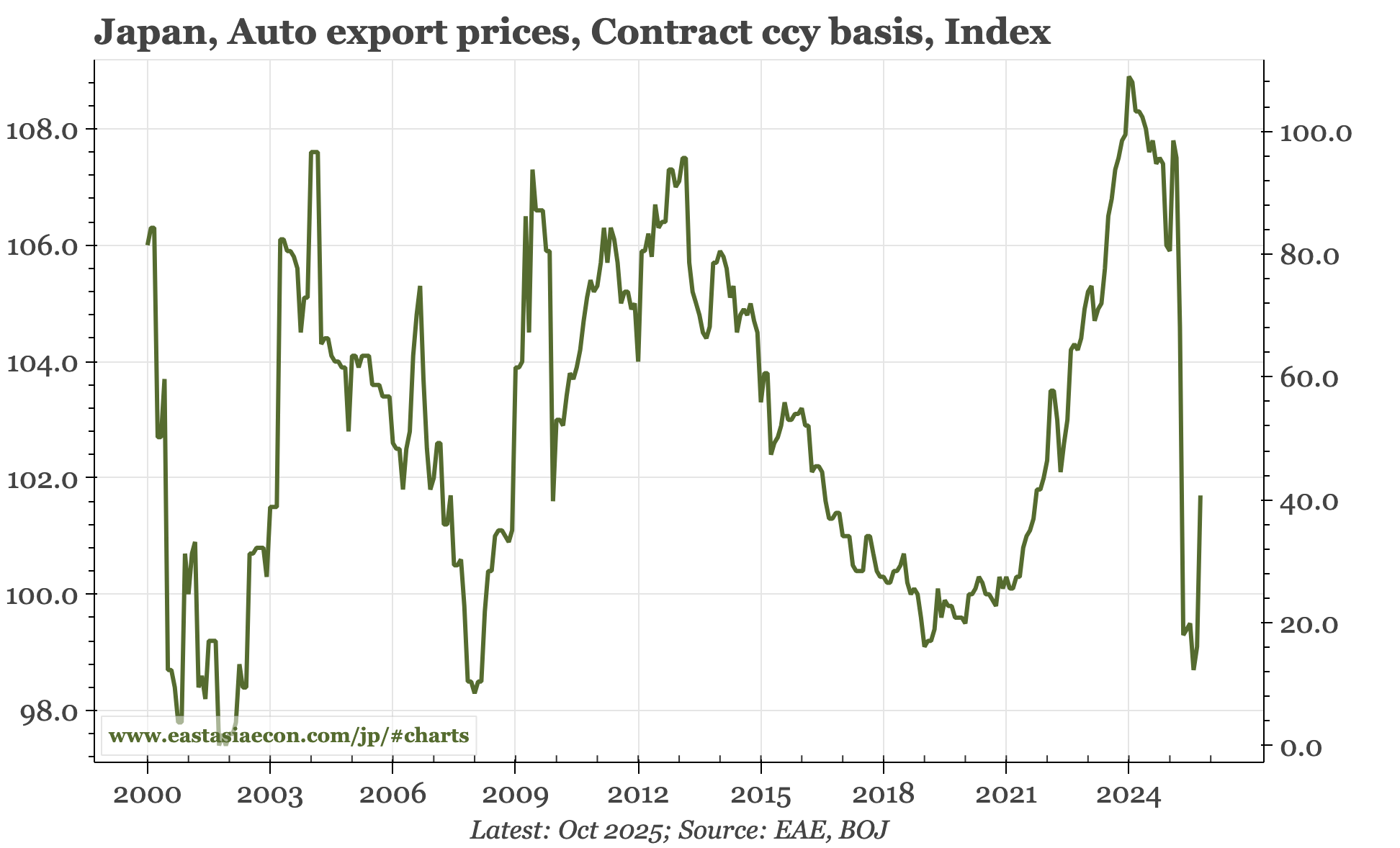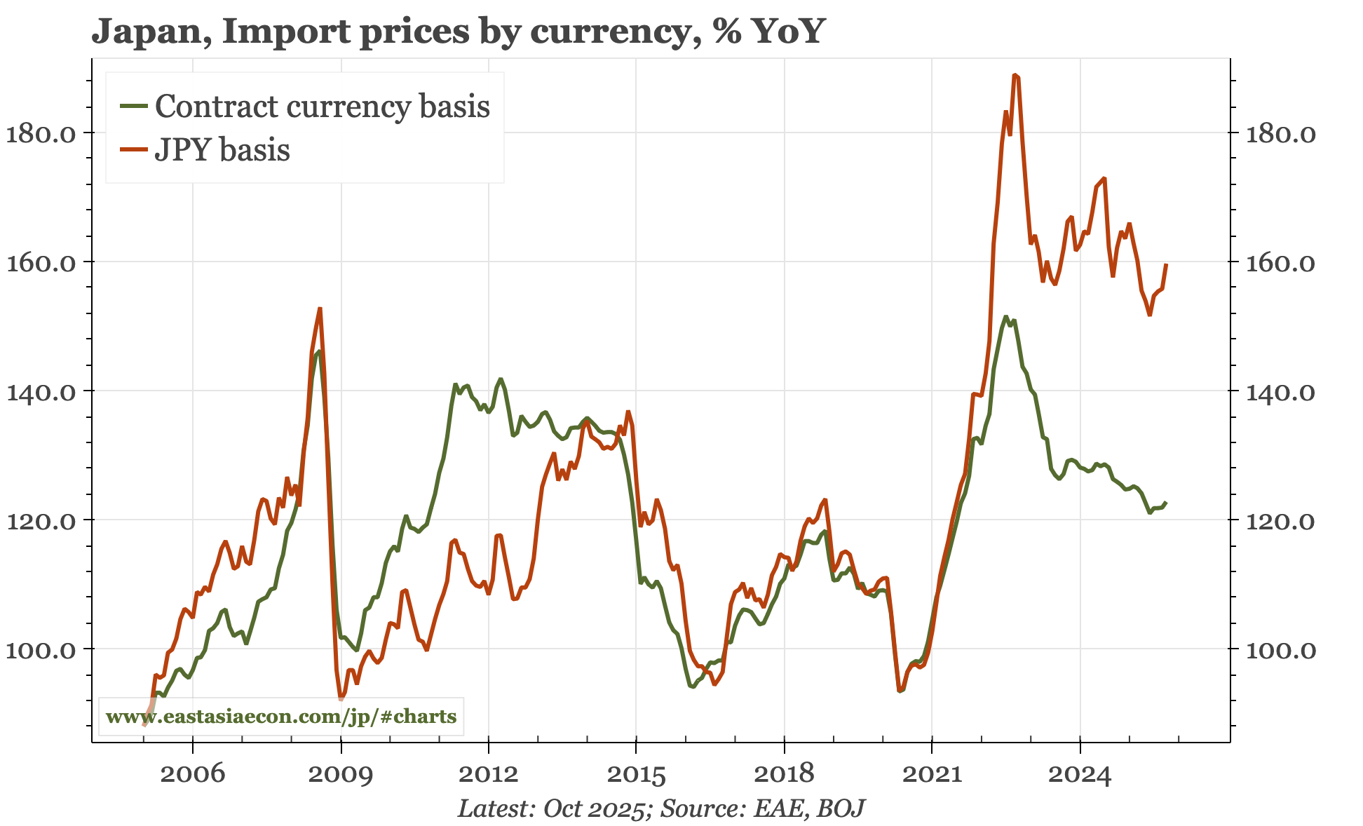 Cycle update – PPI still rising. The gap between import prices and PPI in the October data illustrates the sort of pent-up inflationary pressure in Japan that is likely to be exposed if the JPY remains so weak. Today's data also show a decent rise in auto export prices, but to a level that is still 6% below the pre-tariff level.