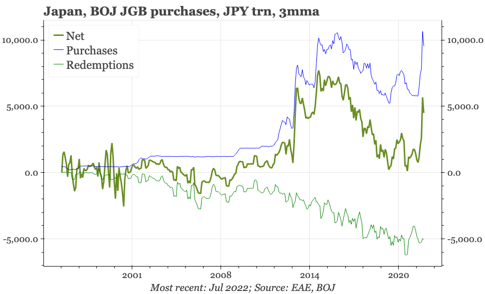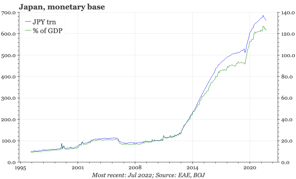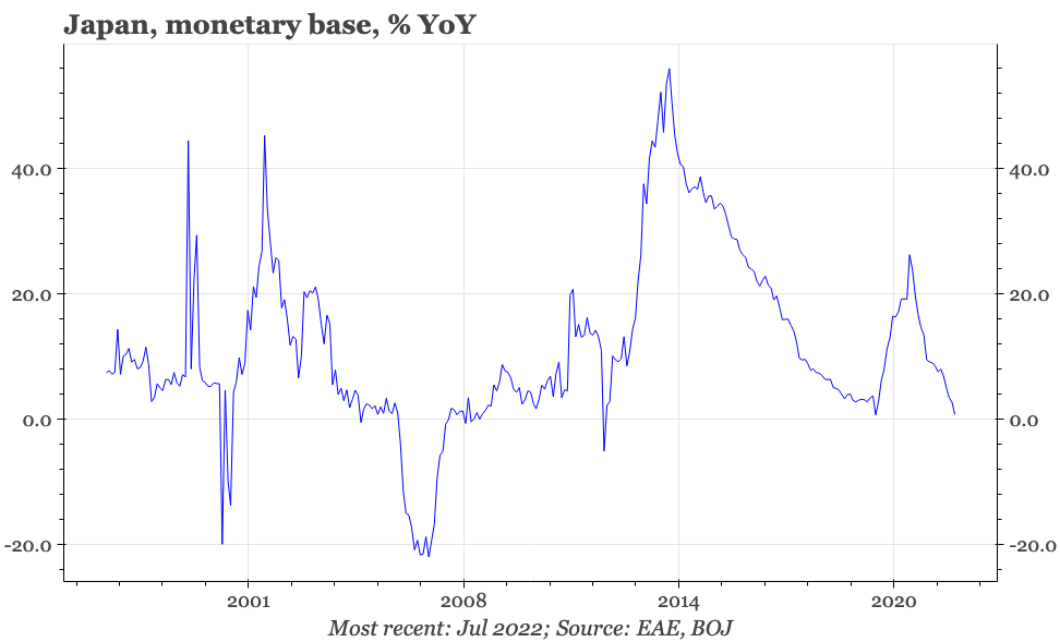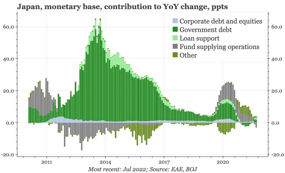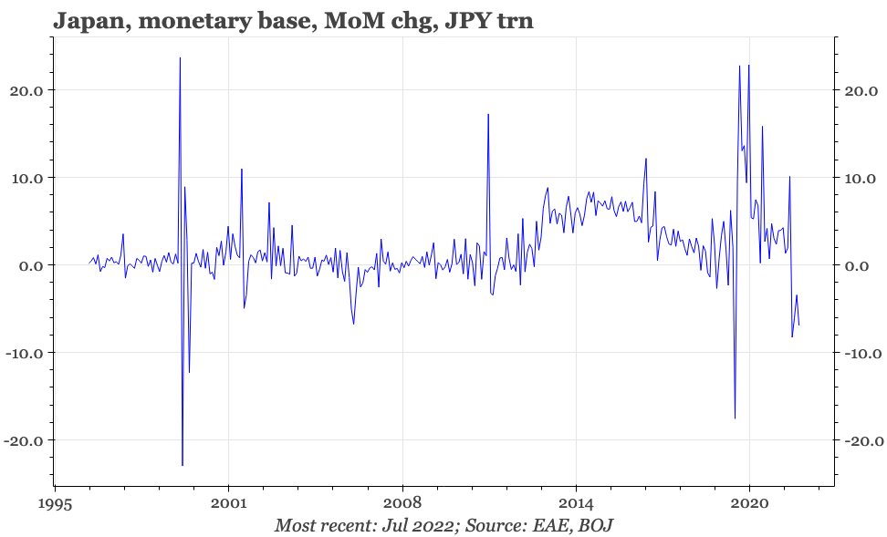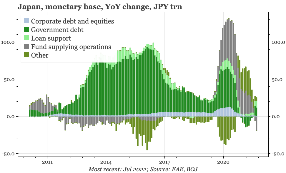 Base money continued to contract in July. The BOJ wasn't pressured to buy JGBs at the same frenetic rate it did in June, and at the same time the Covid-19 loan support facilities continued to roll-off. Assuming US rates don't take a new step-up, then BOJ tapering will likely be the theme for the next few months.