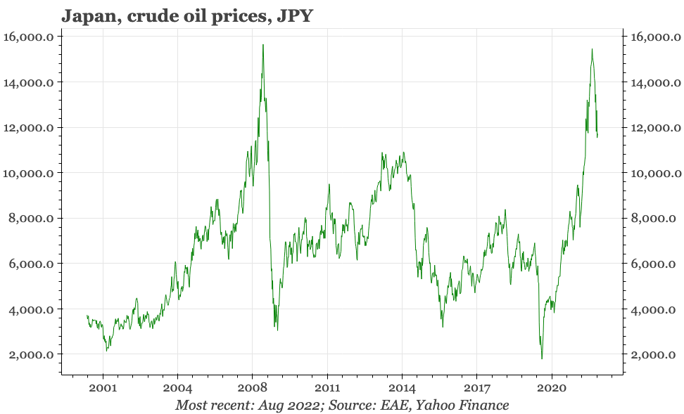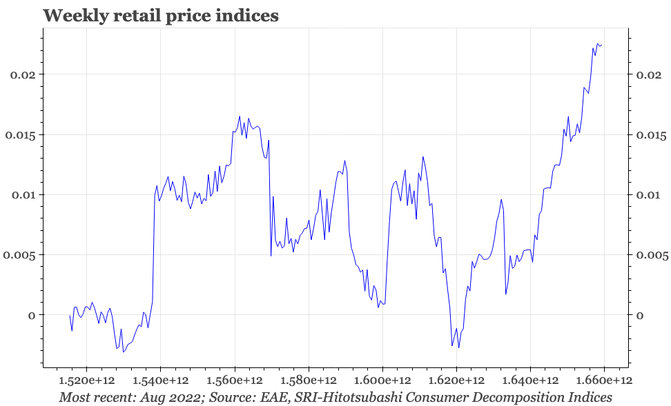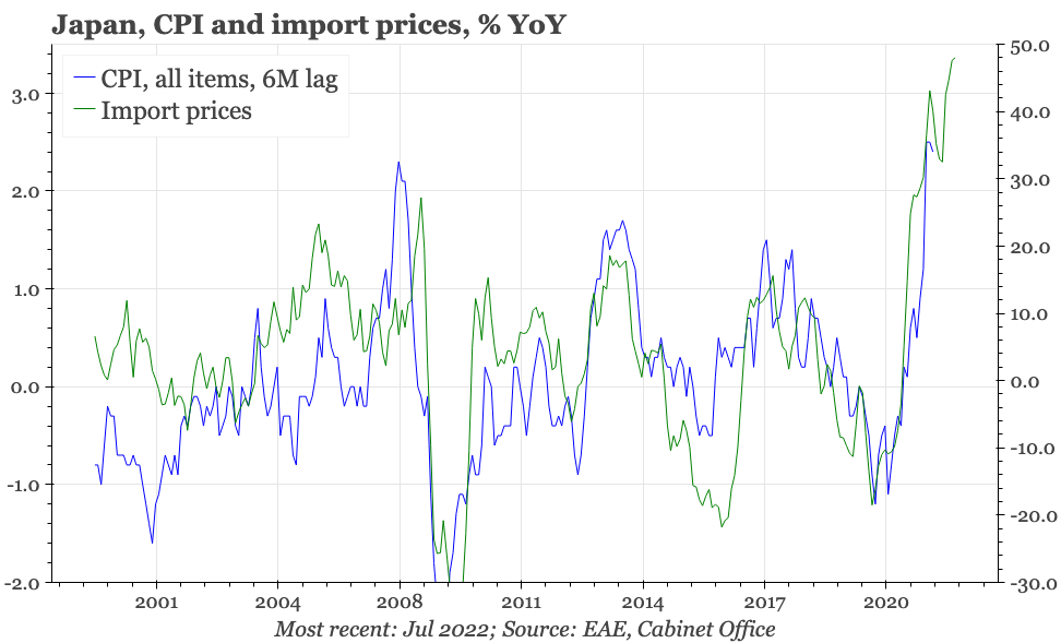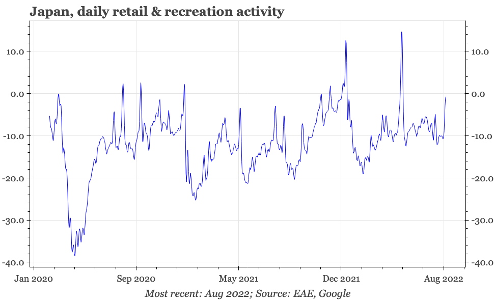 There's likely still some upside for headline inflation in the next couple of months, given the rise in overall import price inflation through July. But signs are again appearing that the peak is near. Crude oil prices in JPY terms are down around 25% from the highs of June, and Hitotsubashi University's weekly retail price inflation shows tentative signs of a peak.