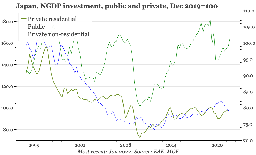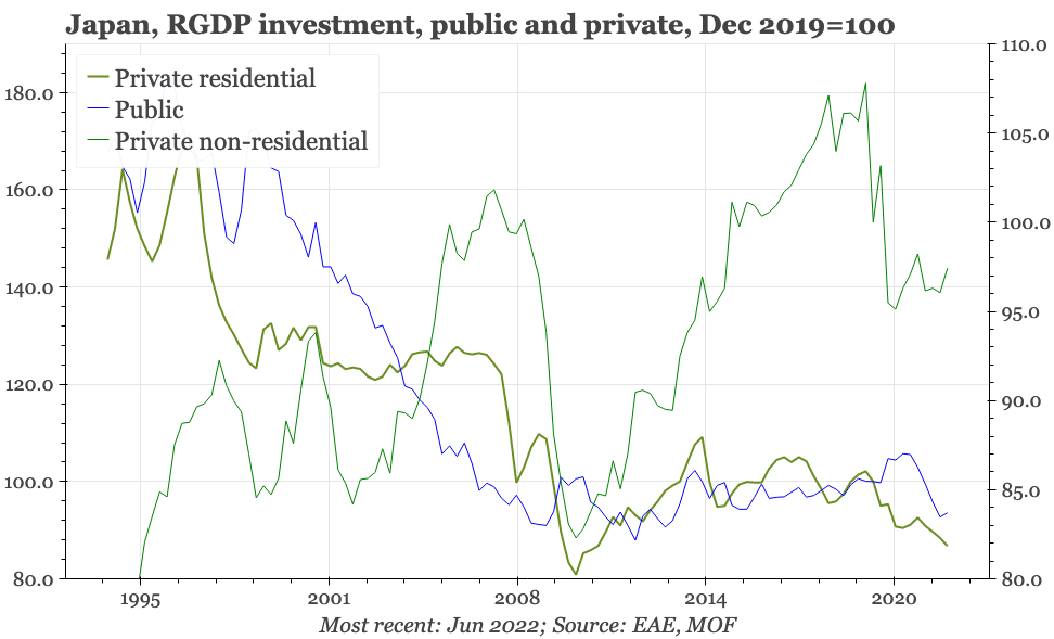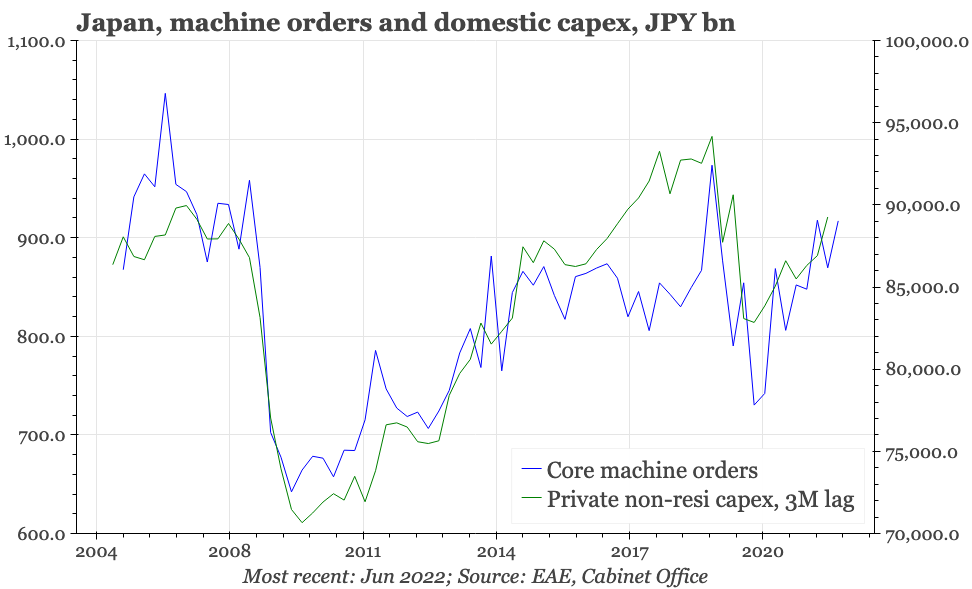 Machine orders though June point to the upturn in domestic capex spending continuing. That said, capex isn't as strong as headline data suggest. A rise is only visible in nominal terms; in real terms, capex is flat-lining overall, with a mild rise in private non-residential investment being offset by weaker out-turns for property construction and public works.