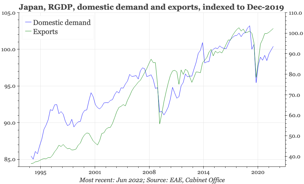 The recovery that has occurred has been led by exports. Domestic demand has started to show stronger momentum in the last couple of quarters, driven by consumption. But consumer spending remains below pre-pandemic levels, whether looked at in terms of spending on goods, or services.
