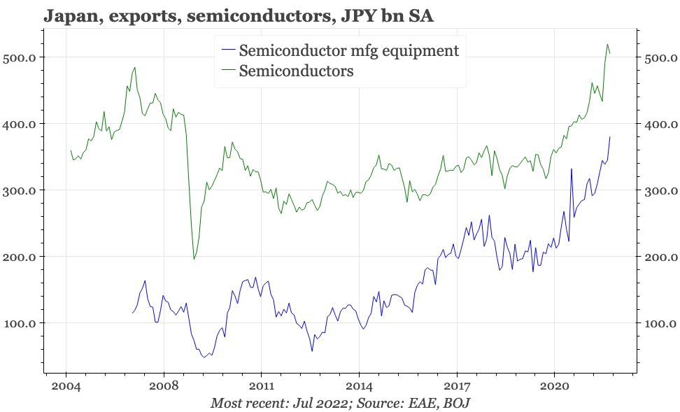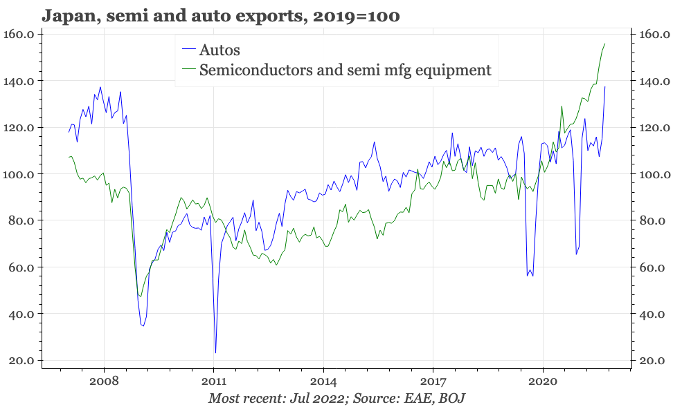 With Japan's tech exports benefiting from the strength in global demand that's lifted semiconductor exports across the region, the weakness in Japan's overall exports relative to the rest of Asia until now has been in large part because of the weakness in world auto trade. With the global tech cycle now seeming to be turning down, it would be particularly helpful for Japan if the auto cycle is now moving up.
