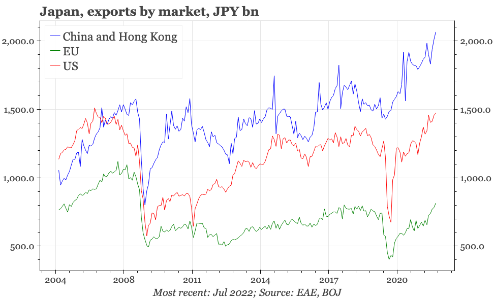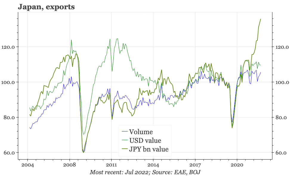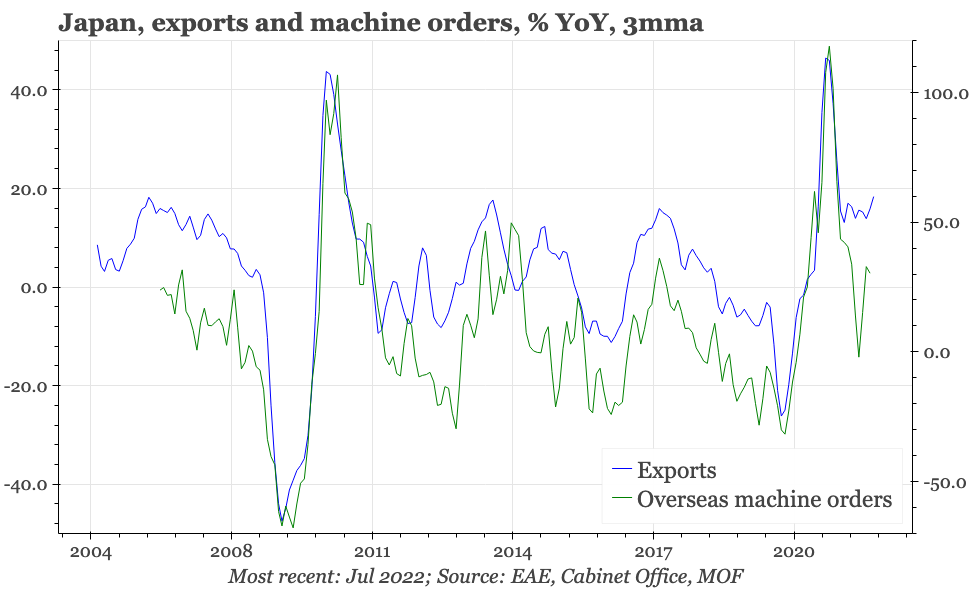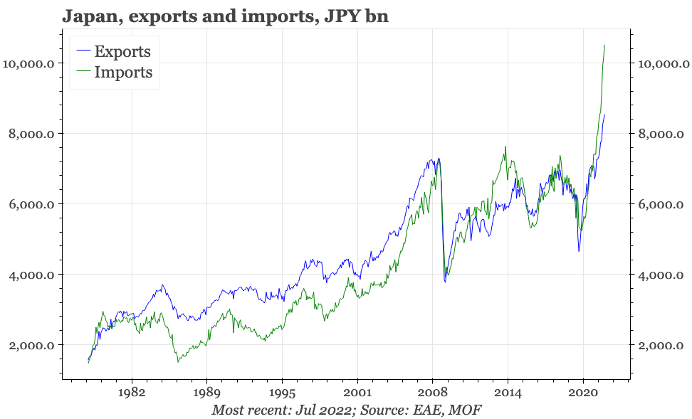 The surprise in machine orders in the last couple of months has been the rebound in orders coming from overseas. However, the relationship with actual exports hasn't been particularly close this year, which may reflect the big moves in the $JPY exchange rate. The depreciation has reversed a little in the last few weeks, but the prior extreme weakness in the currency was clearly seen in July foreign trade data, with both imports and exports surging in JPY terms.