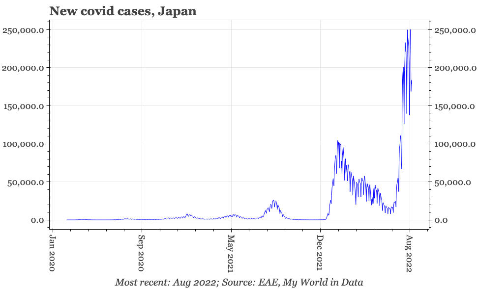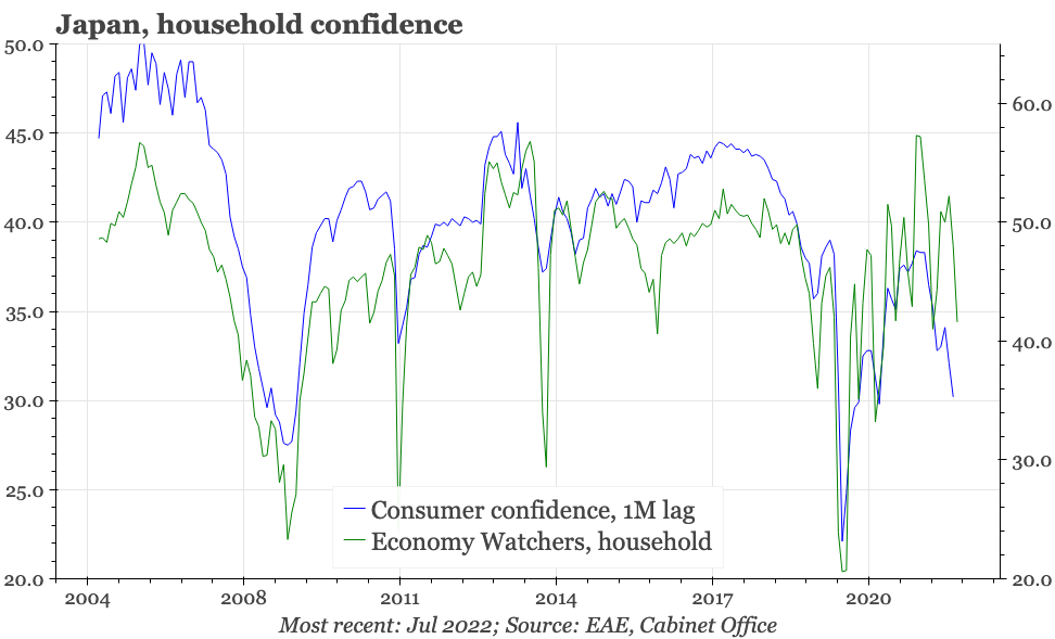 Each Covid-19 wave has had a big impact on Japanese consumption, so it isn't helpful for spending that case numbers are surging again. That though doesn't fully explain why consumer confidence remains weak, with the bigger drag being inflation.