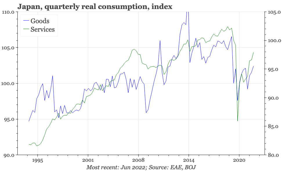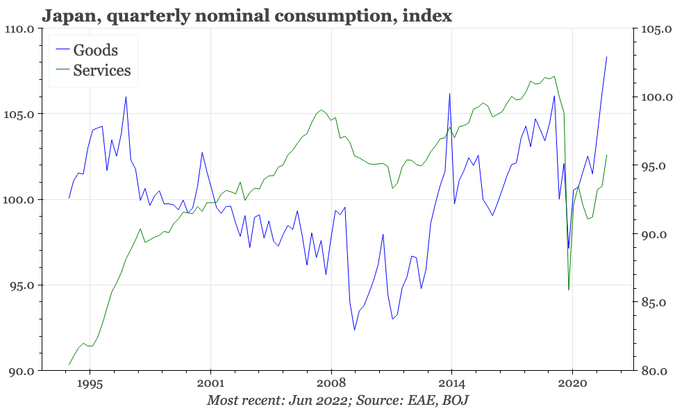 The impact of the relatively rapid rate of rise in the CPI can be seen in the GDP breakdown, with goods consumption in nominal terms rising strongly, even though in real terms the level of spending remains soft. The Economy Watchers survey suggests consumer activity, and the economy in general, is weakening again into Q3.