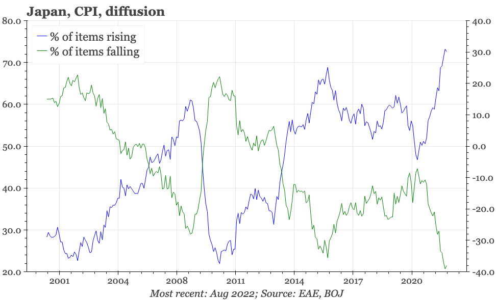The BOJ's inflation diffusion suggests the prices of most products in the CPI basket are now rising. But the bank's official view remains that inflation isn't yet broad-based; instead, according to the bank's monetary policy statement today, inflation in Japan remains focused on “energy, food and durable goods”, which means it expects CPI inflation to decelerate next year “because the contribution of such price rises to the CPI is likely to wane”.