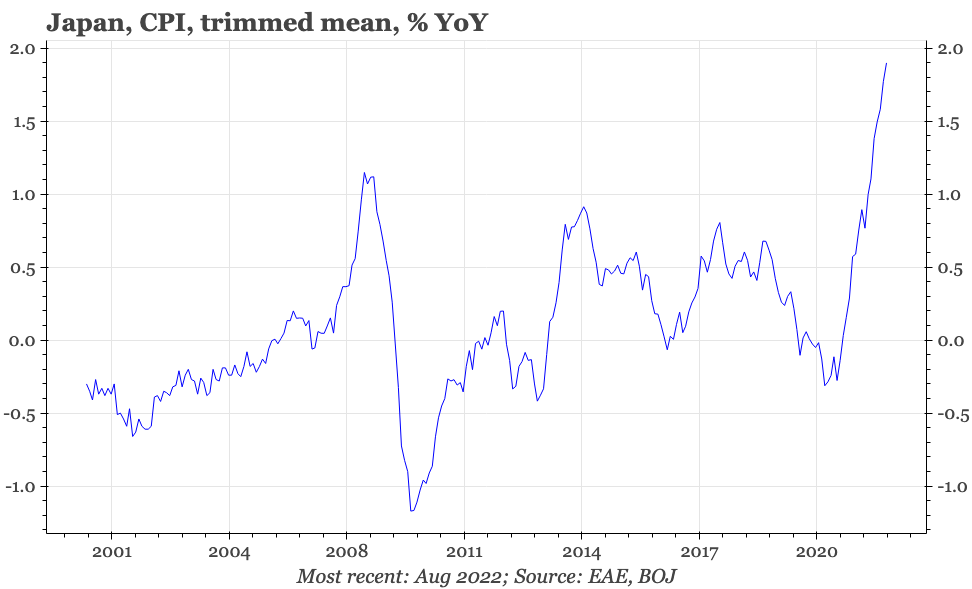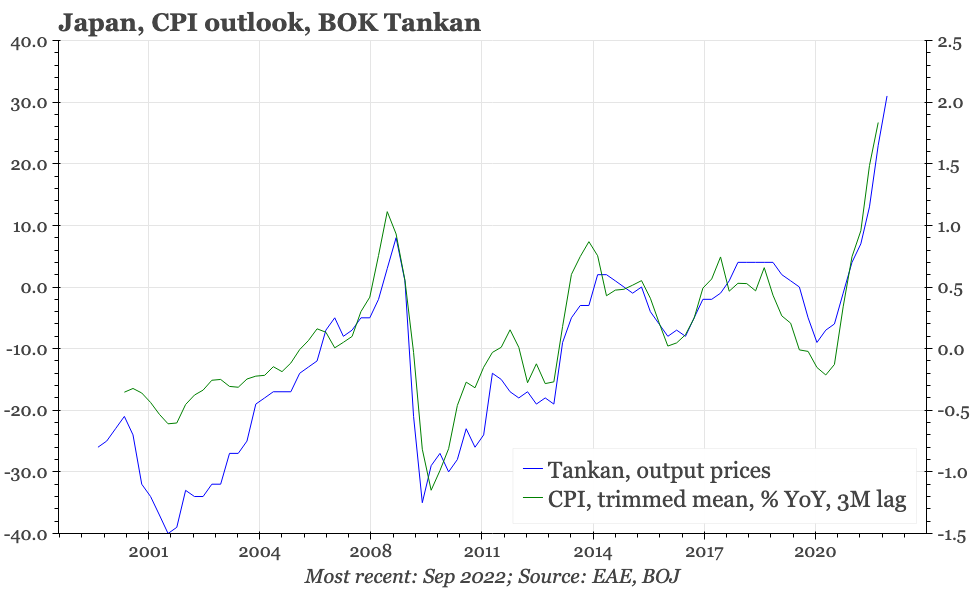 According to the BOJ's calculations of trimmed mean CPI, released today, this measure of underlying inflation reached 1.9% YoY in August. That's another record high since the series started in the early 2000s. On this basis, inflation continues to follow closely the lead of Tankan output prices, which suggest more upside from here.
