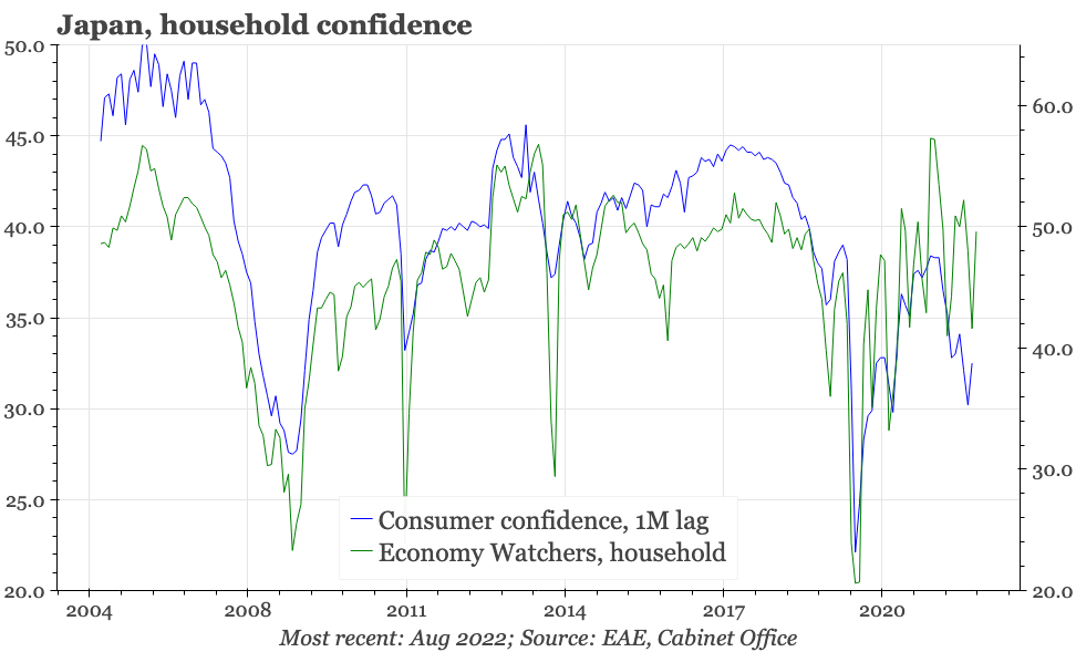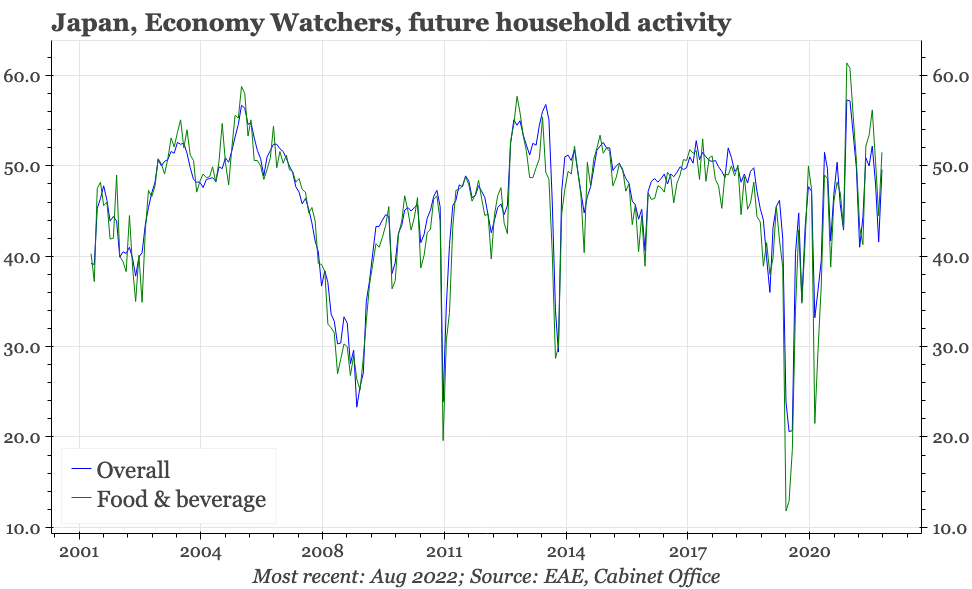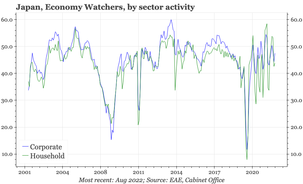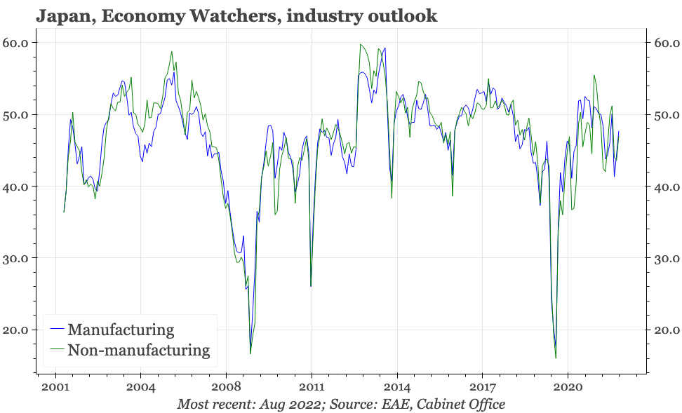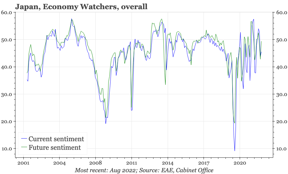 The Economy Watchers survey remains stuck in the see-saw trend that it has been unable to escape from since the pandemic started. After a big fall last month, there was a big rise in August. The overall trend is up, and the average level of recent months is consistent with mild economic growth. But at a bit under 50, overall sentiment isn't strong, and it is difficult to get excited about any upside potential for the economy while sentiment remains this indecisive.