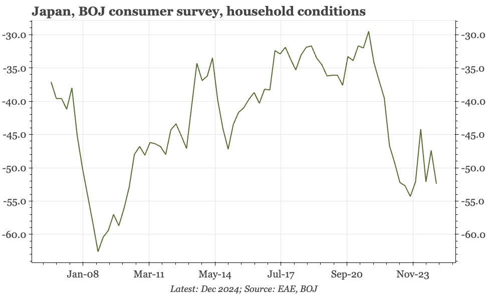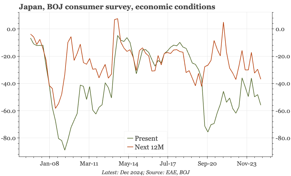 Consumer confidence in the BOJ's Q4 quarterly survey was surprisingly weak in light of other data suggesting the mood has improved. Sentiment around income remained strong, but consumers continue to complain about high prices.