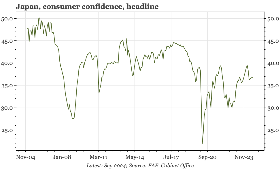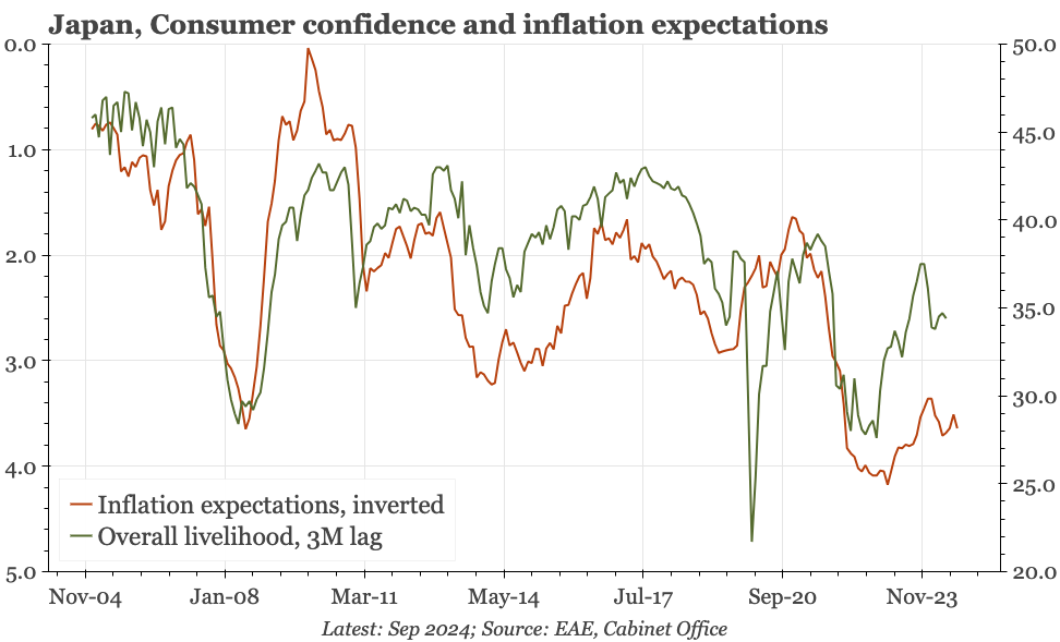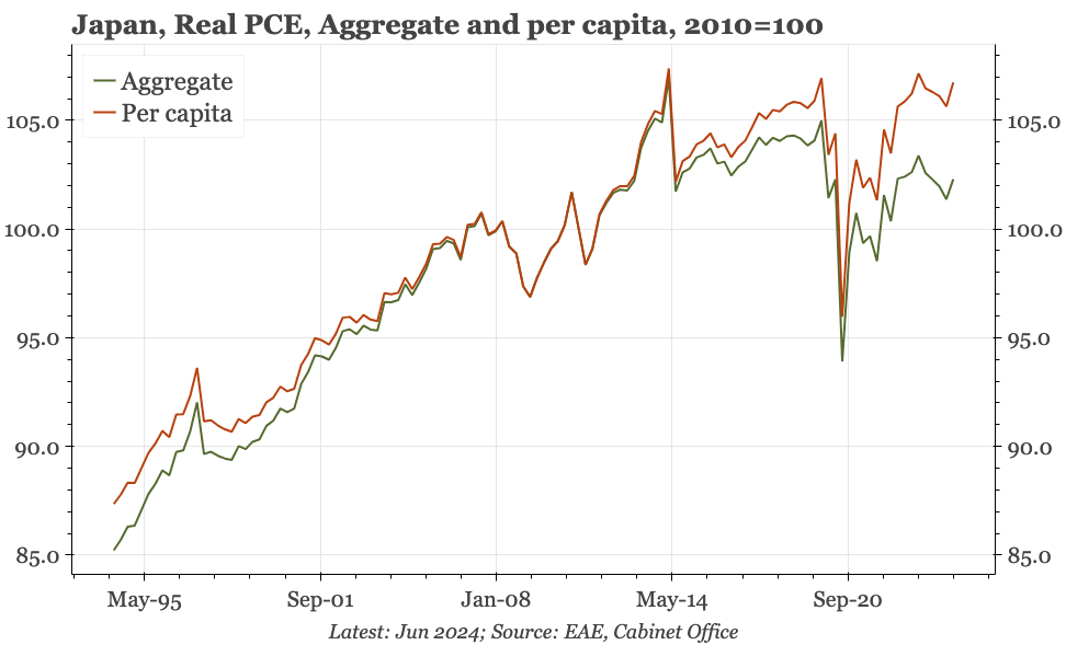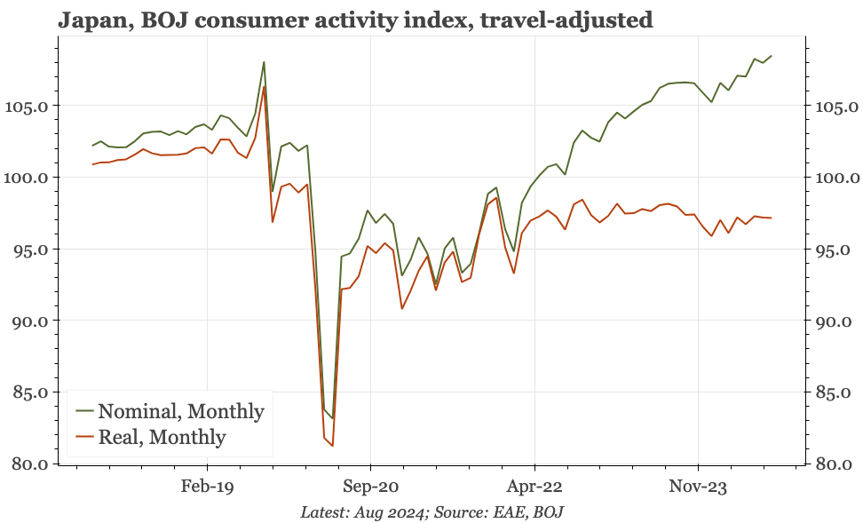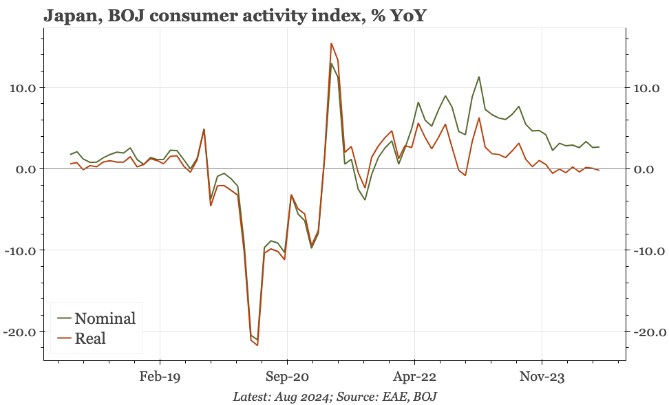 After a better Q2, consumption looks to have basically flat-lined again in July-August, capping any upside in GDP. Consumption isn't falling again, and last week's consumer confidence survey suggests no new deterioration in September. But there is downside risk if the JPY continues to weaken.