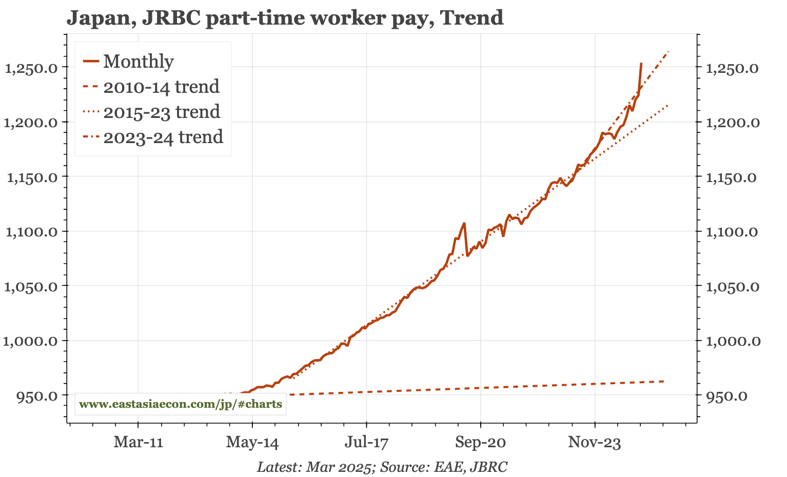 JBRC this week reported March part-time wage growth jumping to 5.6% YoY. Some of that looks like catch-up with the official data, but the commentary was interesting, with the rise being attributed in part to this year's shunto. The labour market continues to look very tight.
