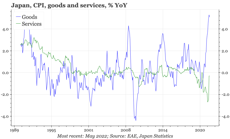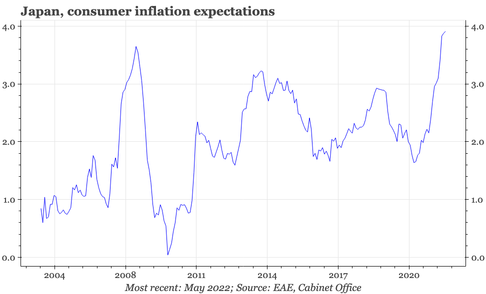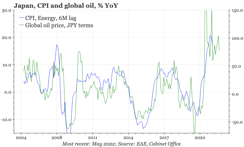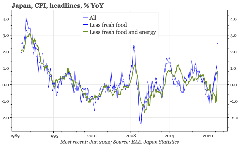 This is consistent with some leading indicators, which had suggested a weakening of inflationary momentum. Despite the depreciation of the JPY during June, it doesn't yet look like CPI pressures are building up again. We'll find out more in the next few days, with inflation expectations in the consumer confidence survey, the BOJ's calculations of underlying inflation, and the Q2 Tankan.