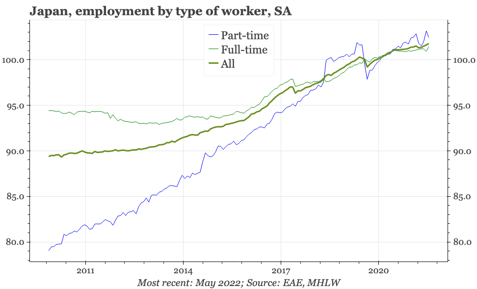 The monthly labour survey shows that the labour market is continuing to tighten, with employment increasing. Overtime hours did fall back a bit in May, but that isn't unexpected given the strong bounce since Q1.