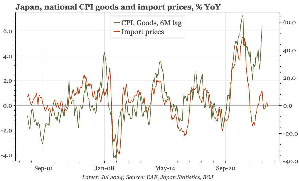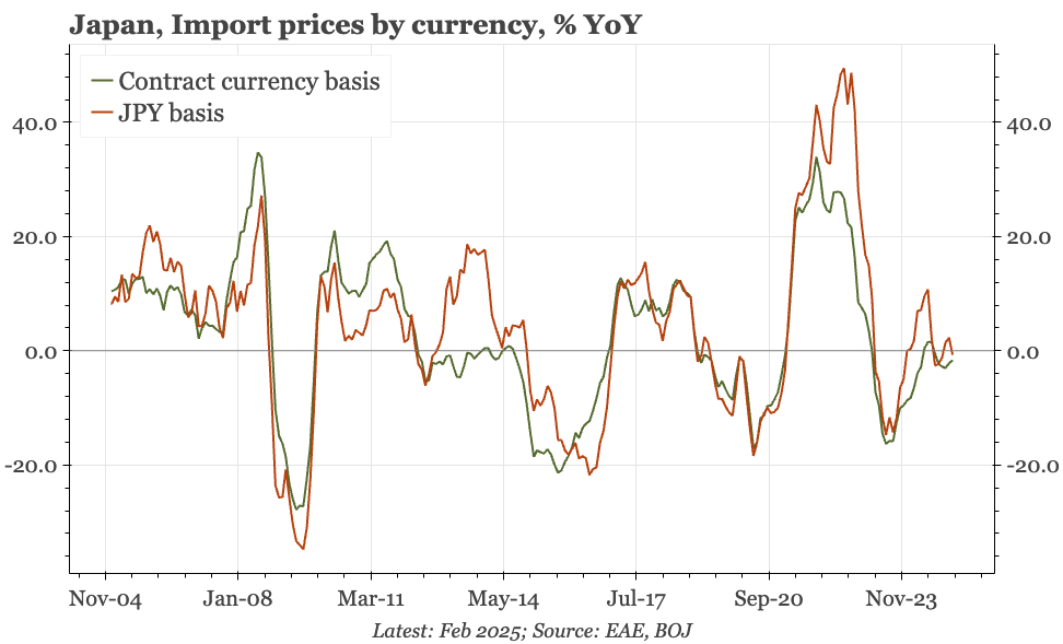 February's 4% YoY PPI sustains the break with import prices. In level terms, the break is more understandable: import prices usually rise more than PPI, then correct with global recession or JPY strength. As yet, they aren't happening, increasing pressure for PPI to rise.