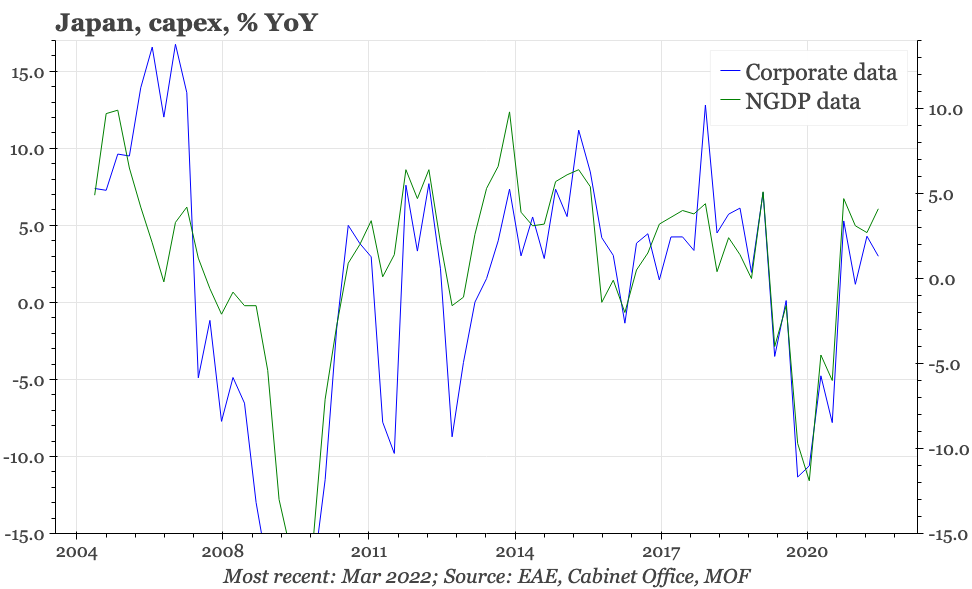 Corporate investment spending was stable in Q1, rising 3% YoY. That's actually higher than the 20-year average of just 1%, so consistent with a structural improvement in the strength of the economy. However, in absolute terms capex was a bit weaker than the investment figure included in the provisional GDP data for Q1, meaning there is downward risk for the revised national accounts data when they are published next week.