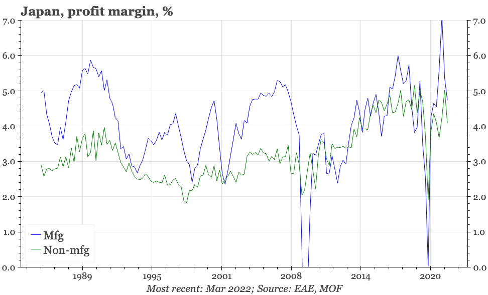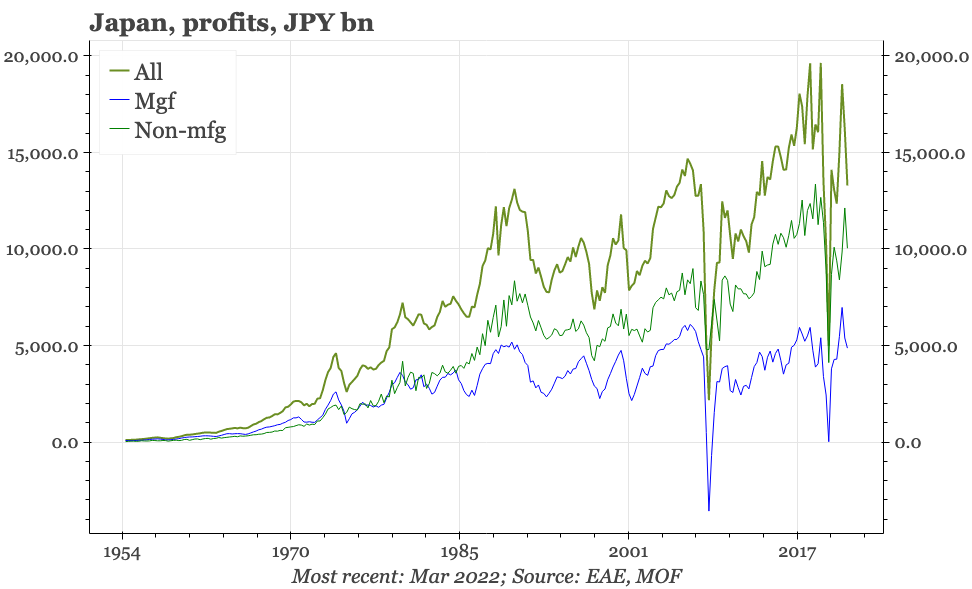 Corporate profits declined in Q1 on the back of a sharp fall in margins in the manufacturing sector. That wasn't particularly surprising, given the rapid increase in input costs through the first few months of 2022.