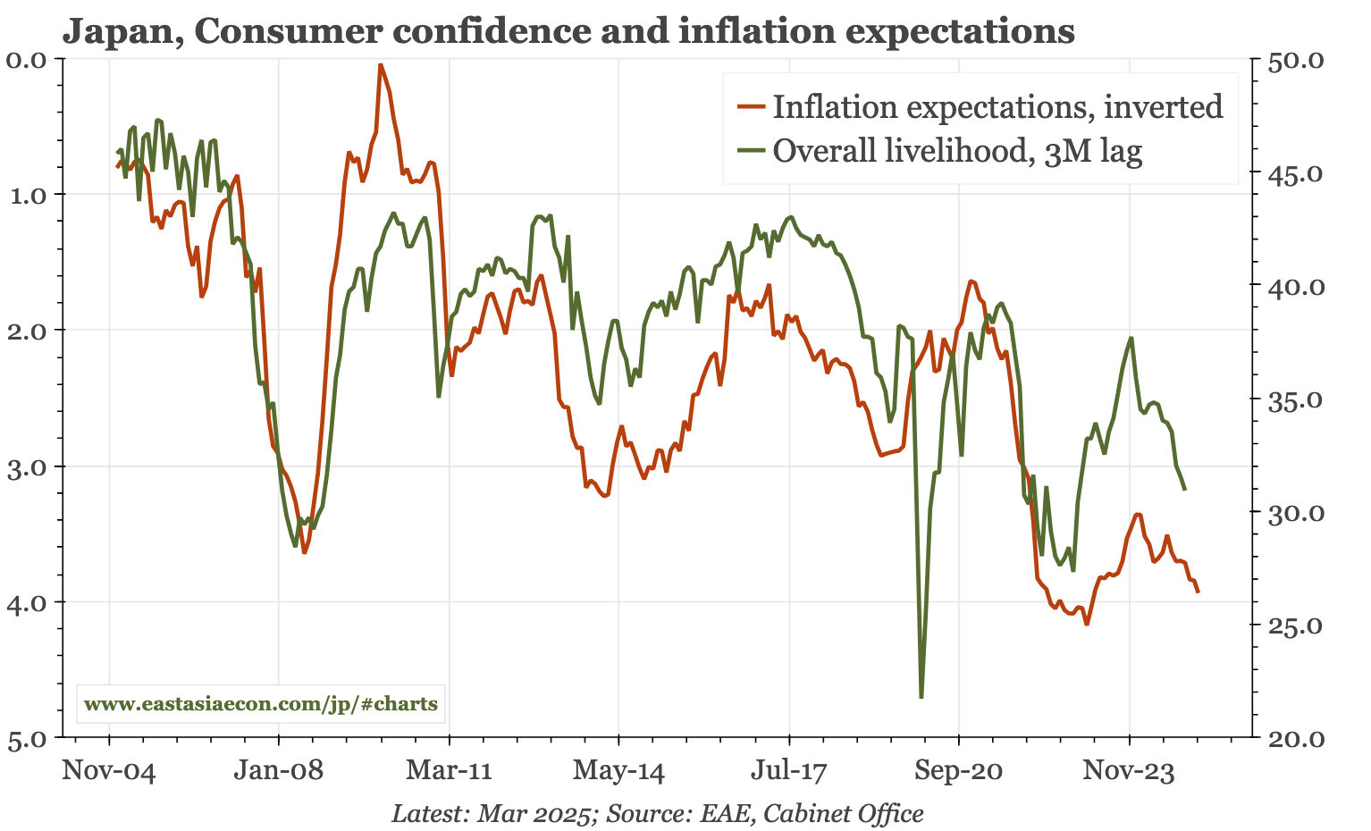 Goods consumption in Japan continues to struggle, with real etail sales dropping in March back to the lowest level in two years. Services consumption has been stronger, but the renewed deterioration coincides with a rebound in inflation, which is once again squeezing real incomes.