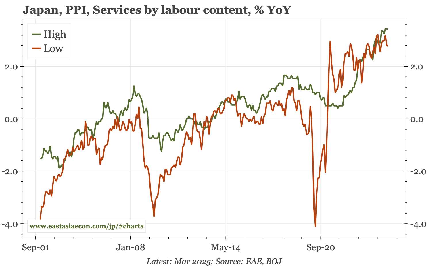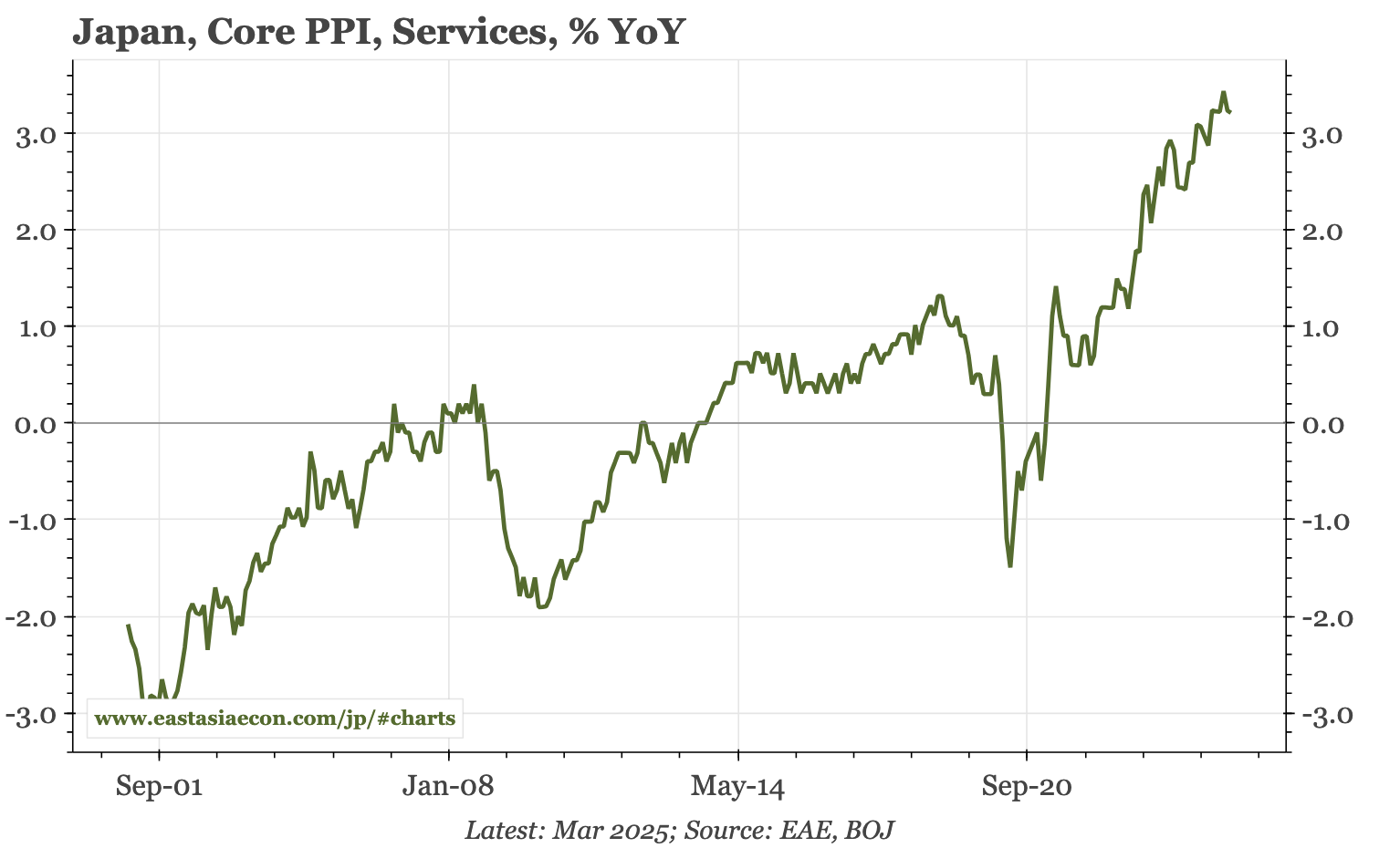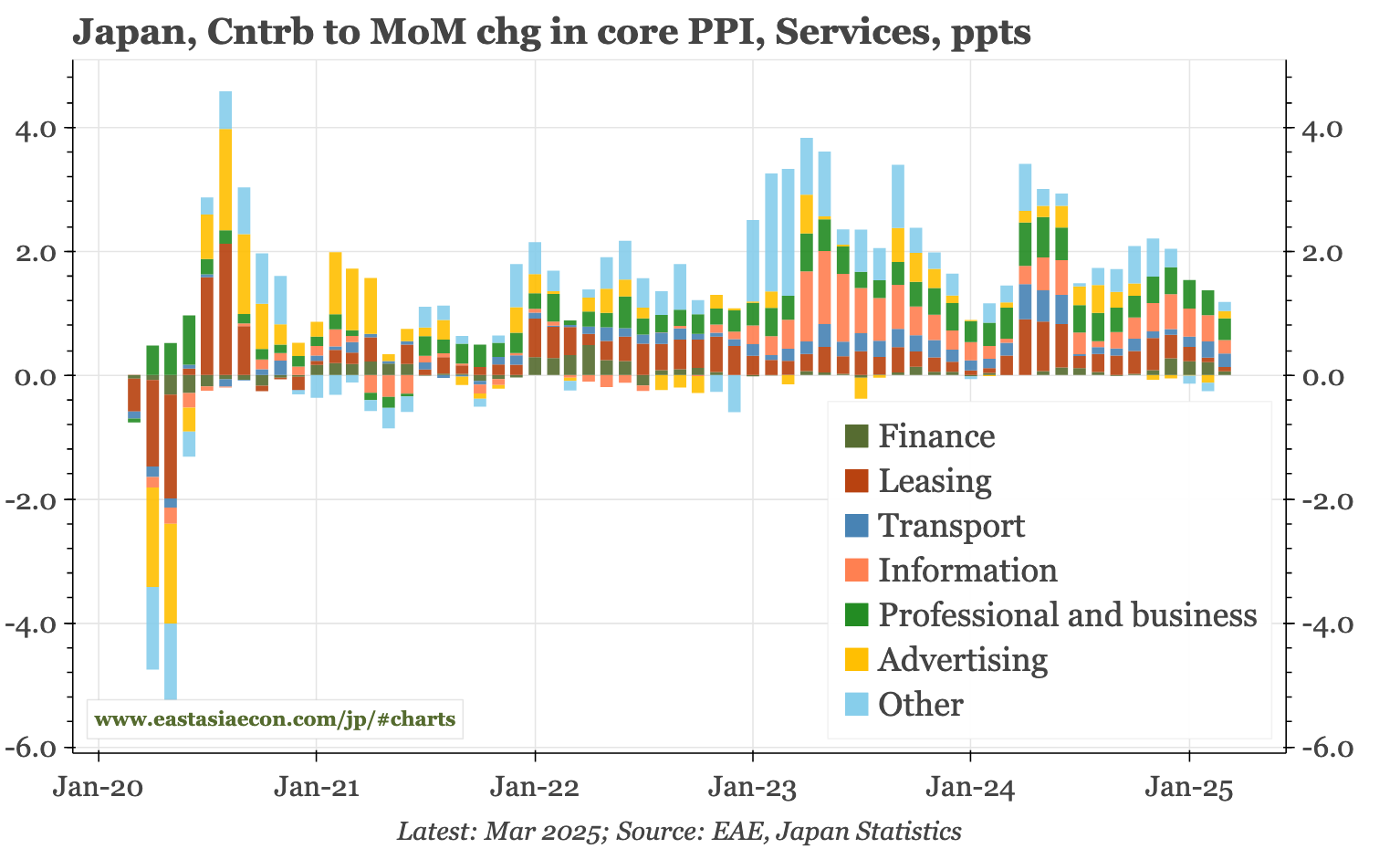 YoY services PPI in March continued to run at above 3%, led by price rises in more labour-intensive sectors. Sequential momentum has eased a bit in recent months, but should get another boost in April, as the latest annual wage round feeds into price rises at the beginning of the new fiscal year.