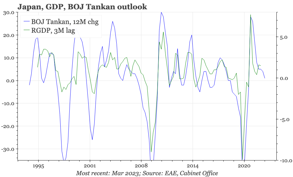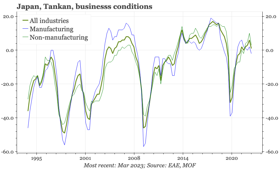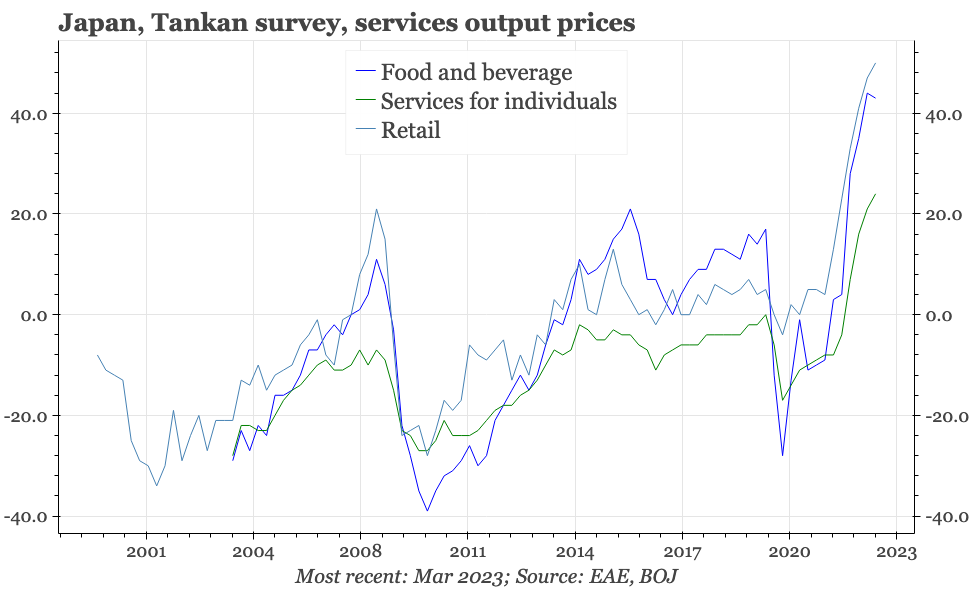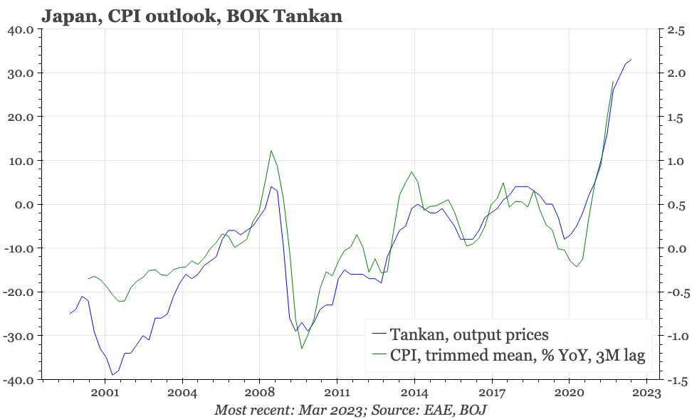 The Tankan points to GDP growth remaining tepid. It does, however, confirm other data showing services price inflation is beginning to emerge. That seems likely to at least persist as Asia opens up after covid, challenging BOJ claims that inflation in Japan is all about energy prices.