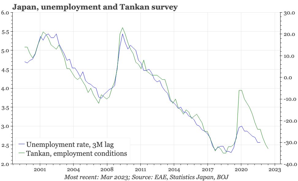 These are welcome developments, but at least as signalled by this quarter's Tankan, the changes don't look powerful enough to really move the macro needle. While the pace of acceleration is easing, output prices in the Tankan are still pointing to inflation rising a bit further. Meanwhile, the tightening of the labour market is in line with other leading indicators pointing to unemployment falling a little more, but not back to the pre-pandemic lows. If that is right, then it seems unlikely wage growth accelerates much further.