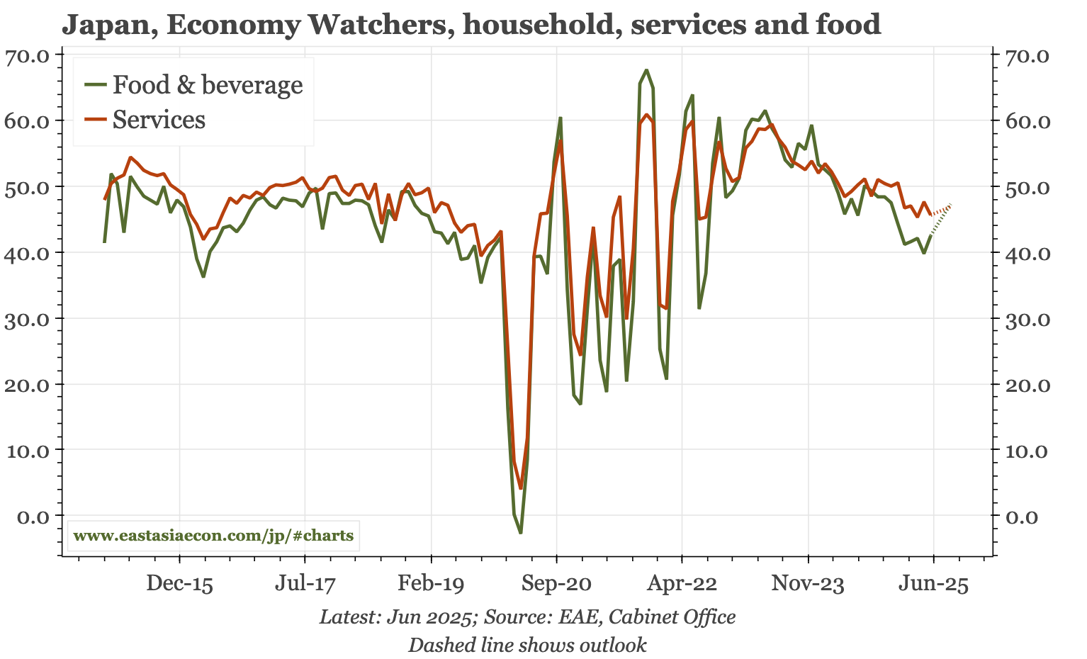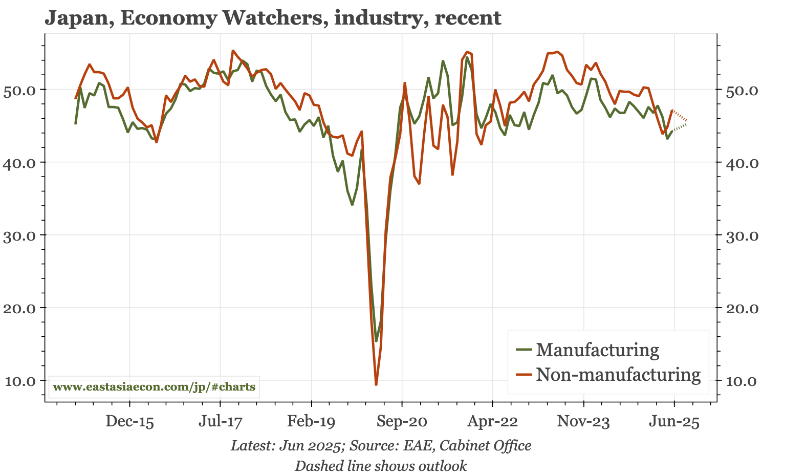 Japan in 2025 has suffered two negative shocks: tariffs, and a rebound in CPI that's eroded real incomes. June surveys, such as today's EW, show the household mood starting to improve as the price shock wanes. But that won't matter if Trump proceeds with the yet higher tariffs he's now threatening.