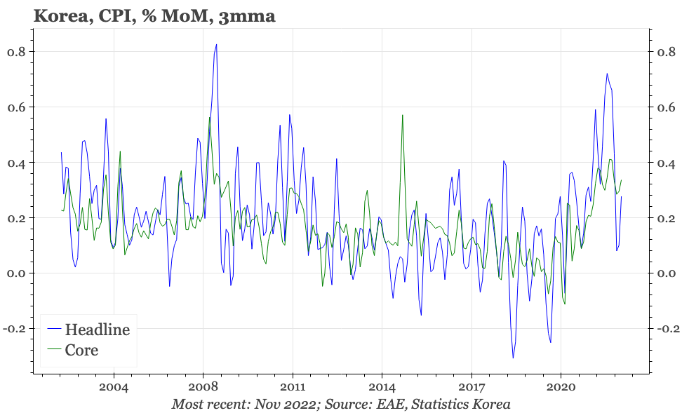 Core inflation, however, continued to rise, increasing slightly to 4.3% YoY in November, a new post-2008 high. That was partly base effect, but on a MoM basis, core CPI also remains elevated, continuing to run at the 4-ish% annualised rate first reached in late 2021. Again, that is much higher than the BOK's target, and also significantly above the 1.5% average of 2012-19.