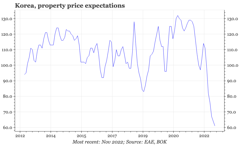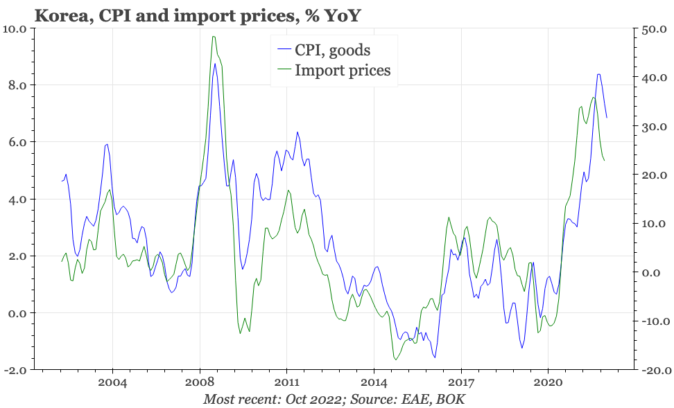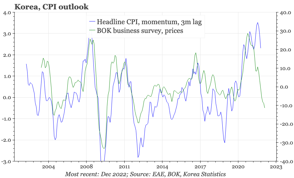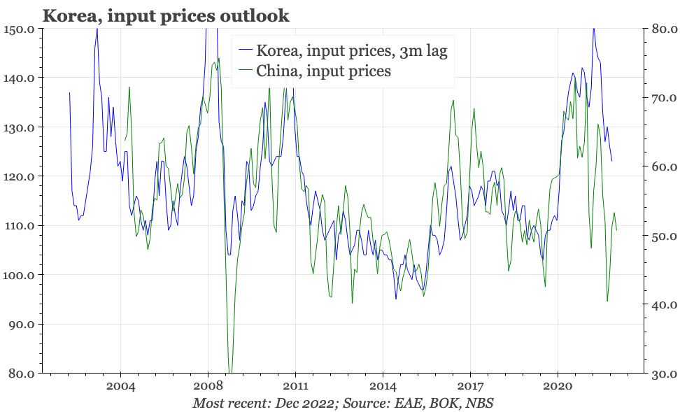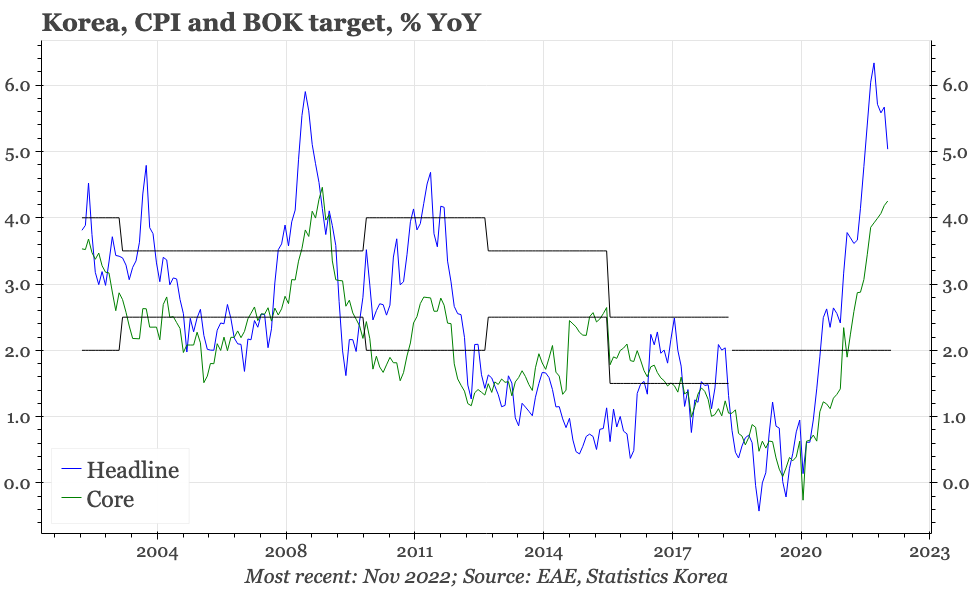 Overall CPI inflation in Korea fell back to 5% in November. That is still a long way above the BOK's 2% target, but is at least down from the peak of 6.3% in July. Moreover, leading indicators suggest the decline should continue.