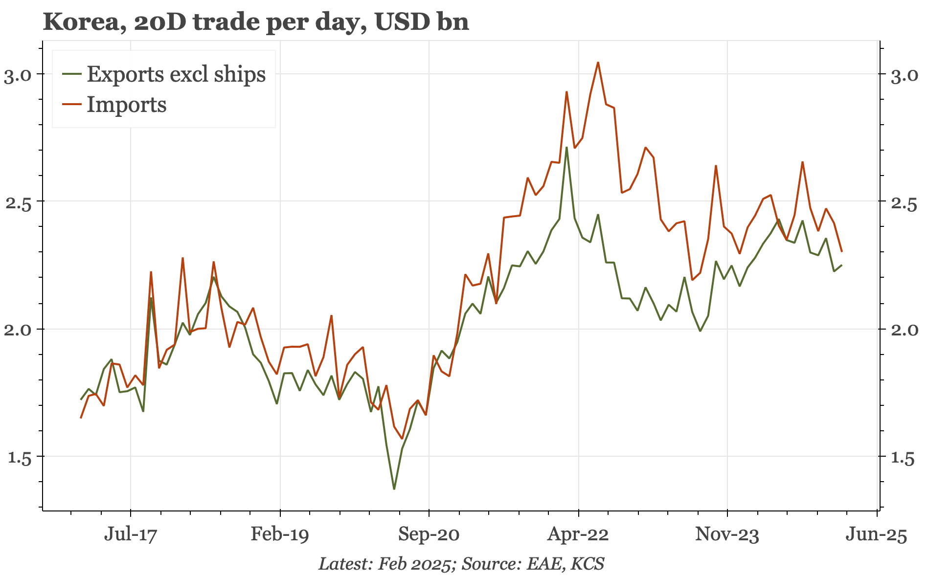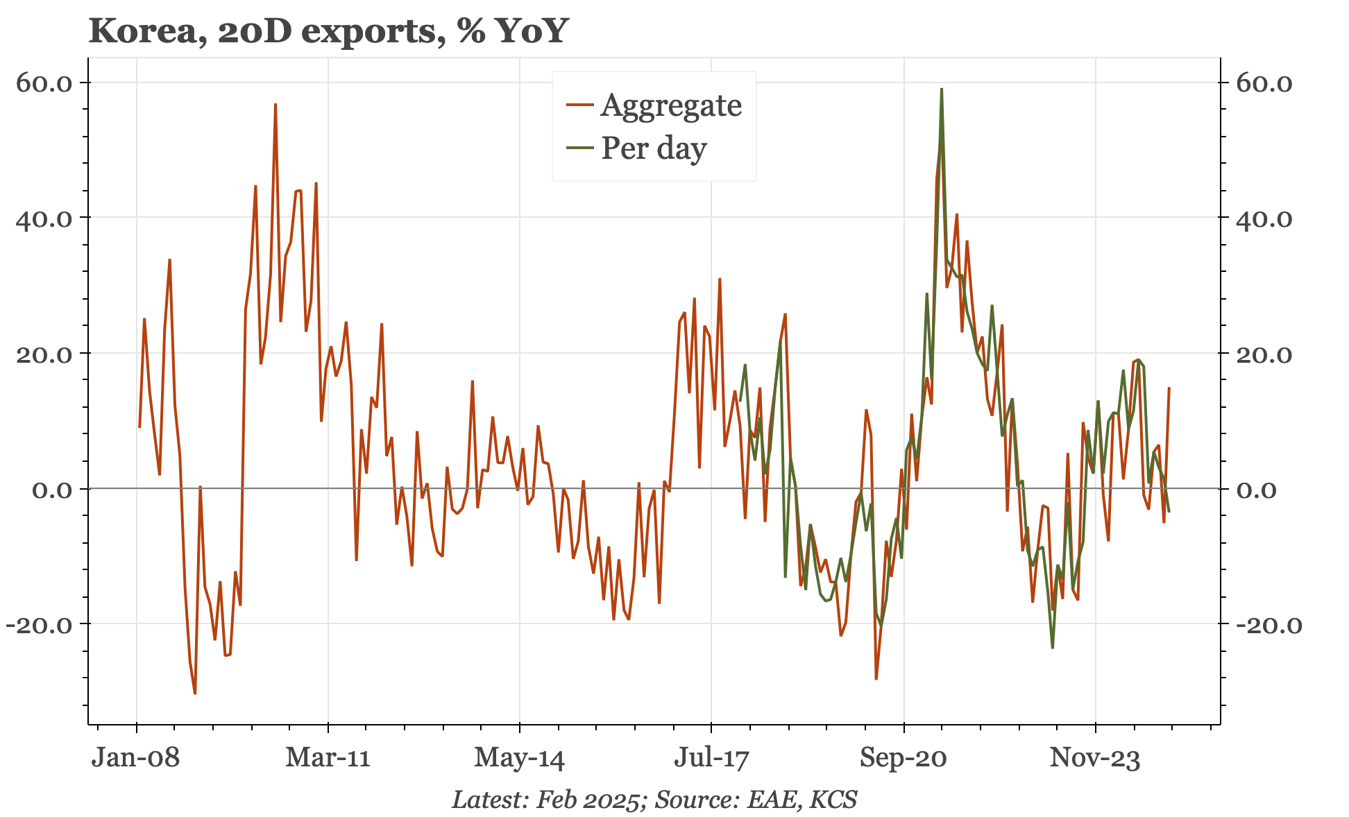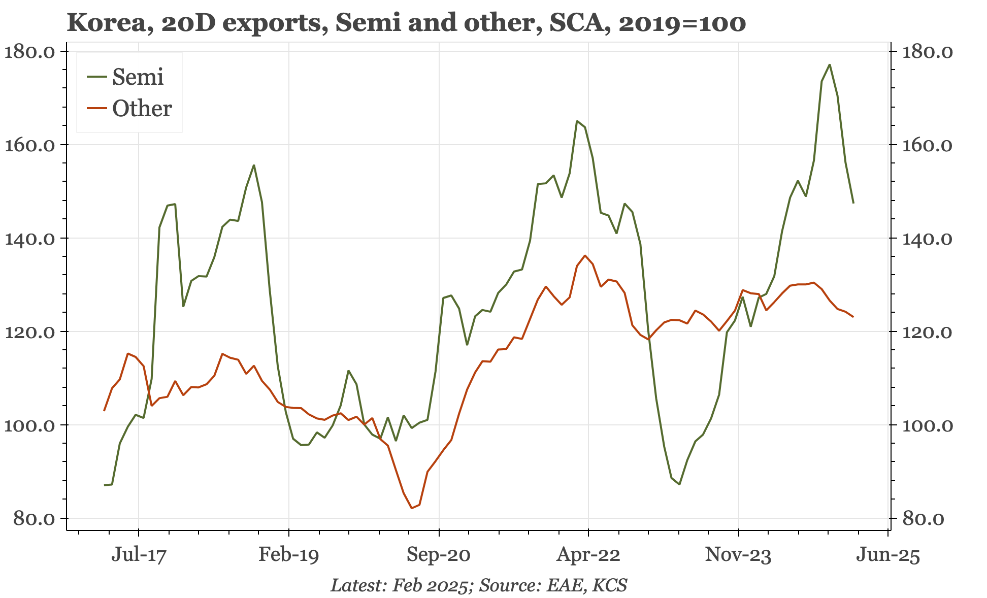 Adjusted for holidays, and exports barely grew in the first 20 days of February. The big driver is the downturn in semi shipments. Equity performance suggests the relative underperformance of Korean exports relative to China and Taiwan will continue.